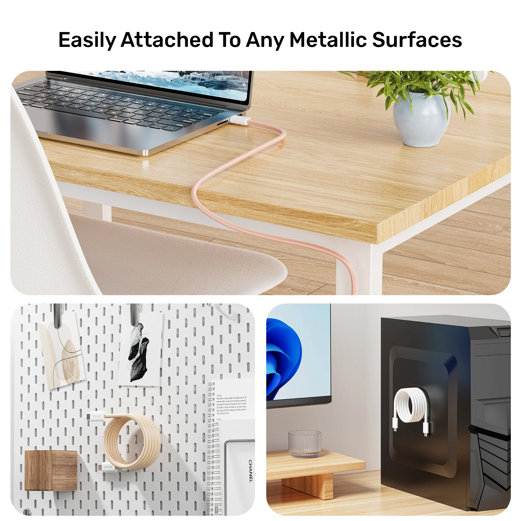 A: The magnetic design works best on metallic surfaces . On non-metallic surfaces, the cable can still be used normally but will not magnetically attach. The magnetic winding feature allows the cable to coil onto itself regardless of surface. For more cable management solutions, browse the UNITEK Reusable Hook and Loop Cable Management Ties.