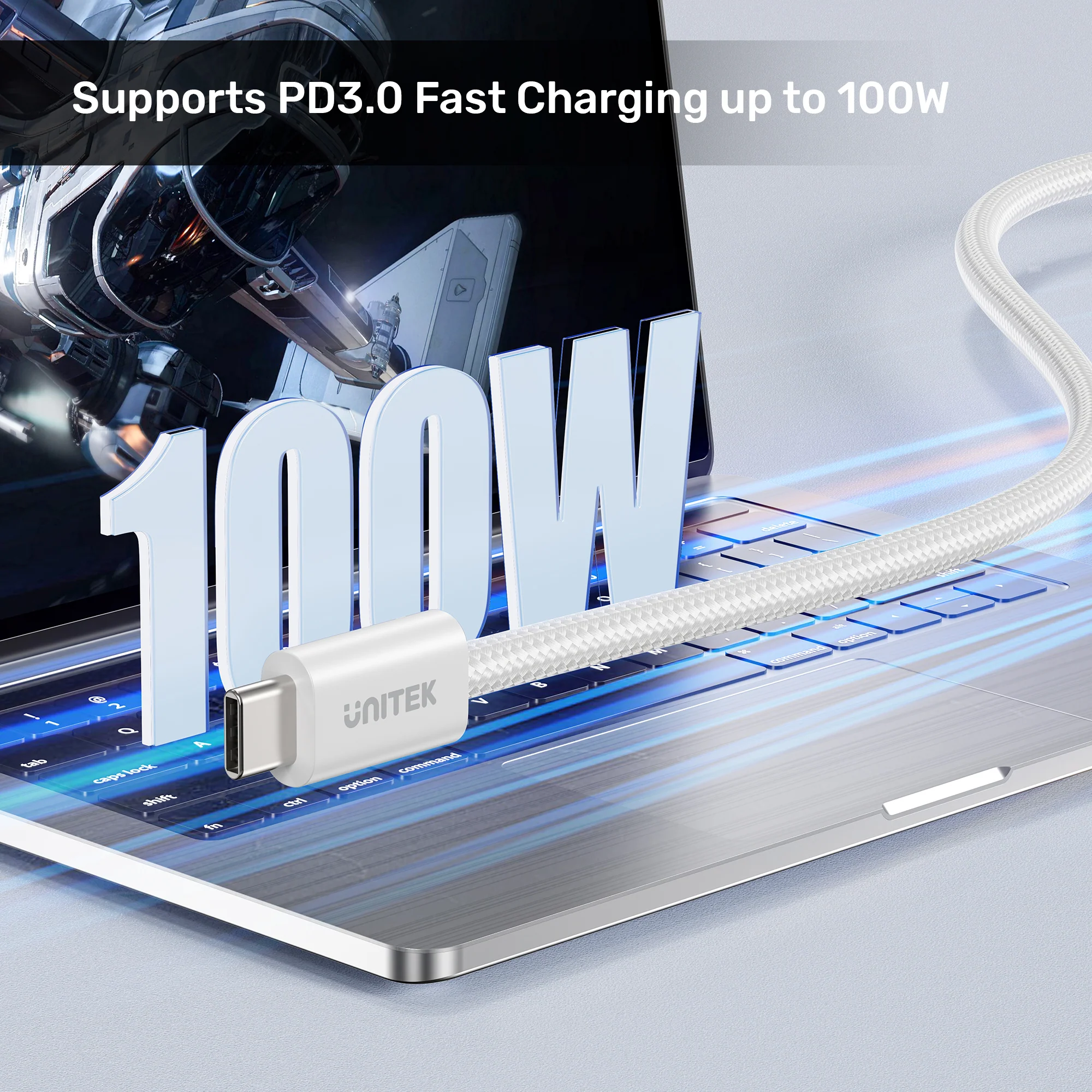 The key advantage is its 100W PD3.0 fast charging capability . Delivering an impressive 100W output (20V 5A) , this enables charging speeds that are 52% faster than standard 60W cables. Users can charge devices like the MacBook Pro 13” from 0% to 39% in just 30 minutes , or power up an iPhone 15 from 0% to 60% in the same timeframe. Experience rapid and efficient charging for all your devices with this high-performance cable. For more fast charging solutions, browse our UNITEK PD 60W USB-C Cable with LED Display and the UNITEK 240W USB-C to USB-C PD 3.1 Fast Charging Cable.