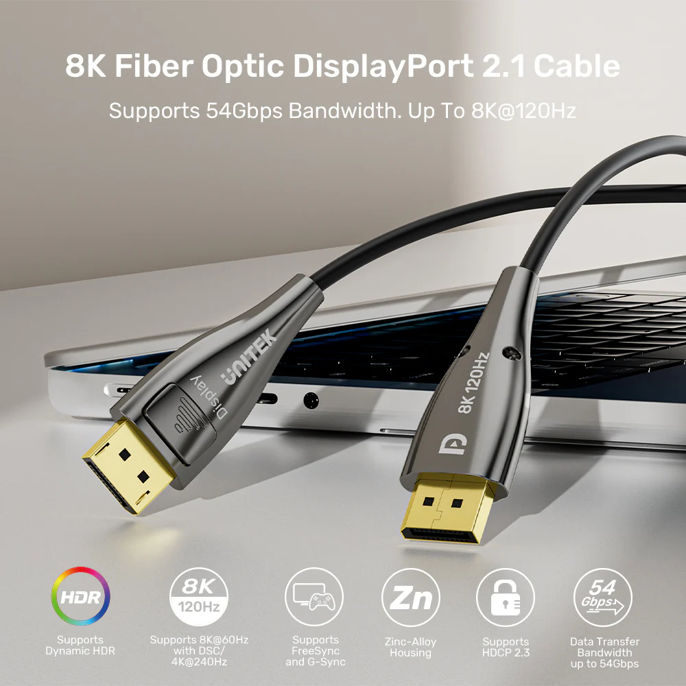 A: This cable delivers 54 Gbps bandwidth (UHBR13.5) , which is the full DisplayPort 2.1 specification. This is significantly higher than DisplayPort 1.4 (32.4 Gbps) and allows for uncompressed 8K@120Hz or 4K@240Hz. When searching for the Best 8K DisplayPort 2.1 Cable in Pakistan , this UNITEK fiber optic cable is the top choice for long-distance, high-performance connectivity.