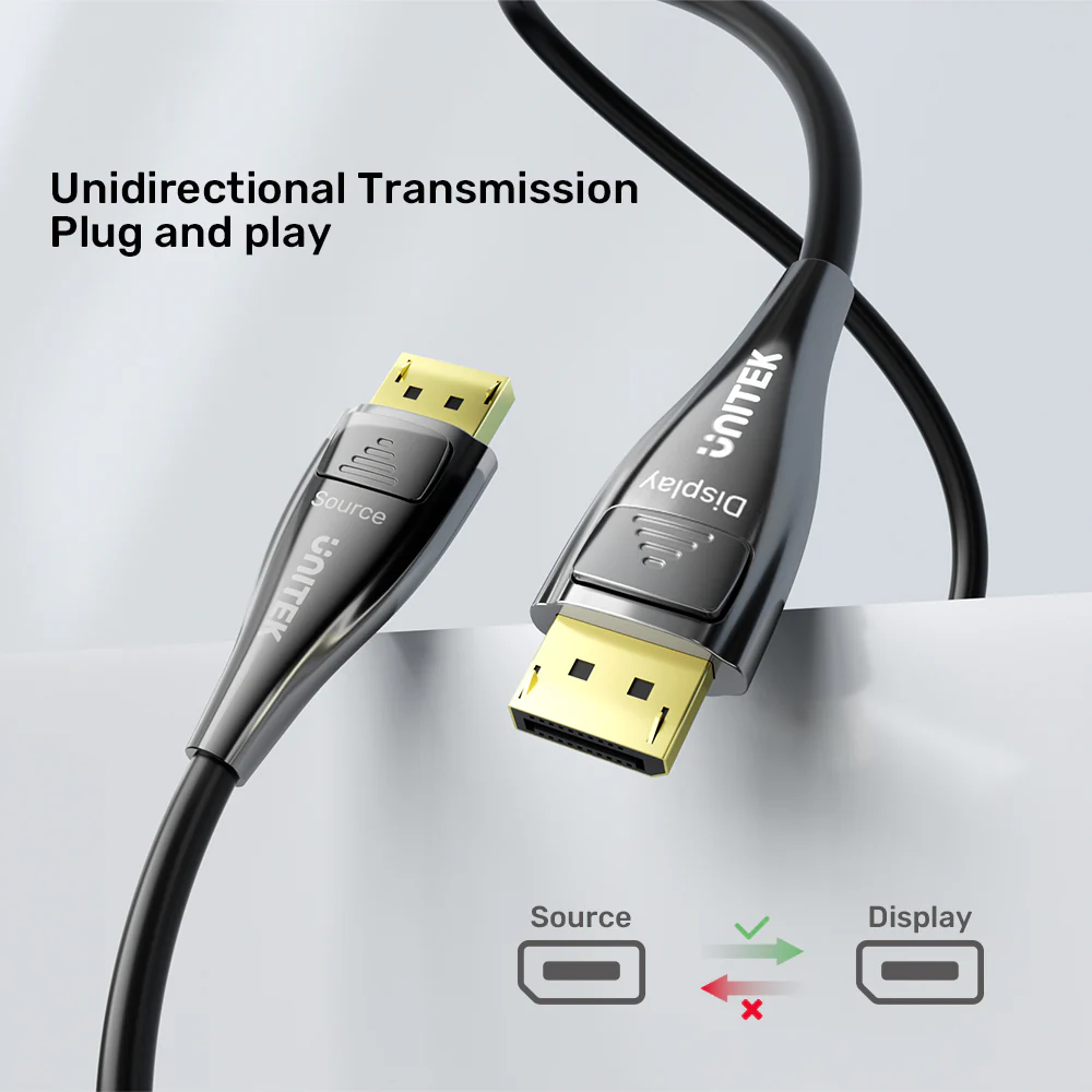 Plug and play with no drivers or adapters needed . This cable features one-way transmission : connect the “Source” end to your device, such as a PC, laptop, or graphics card, and the “Display” end to your display device, such as a monitor, TV, or projector. Ensure that you plug in the correct end; otherwise, you will not receive a signal from the device. The cable is available in 10M, 20M, and 30M lengths to suit any setup. For more UNITEK connectivity solutions, browse the UNITEK DP to HDMI Adapter and the UNITEK USB C to DisplayPort Cable.