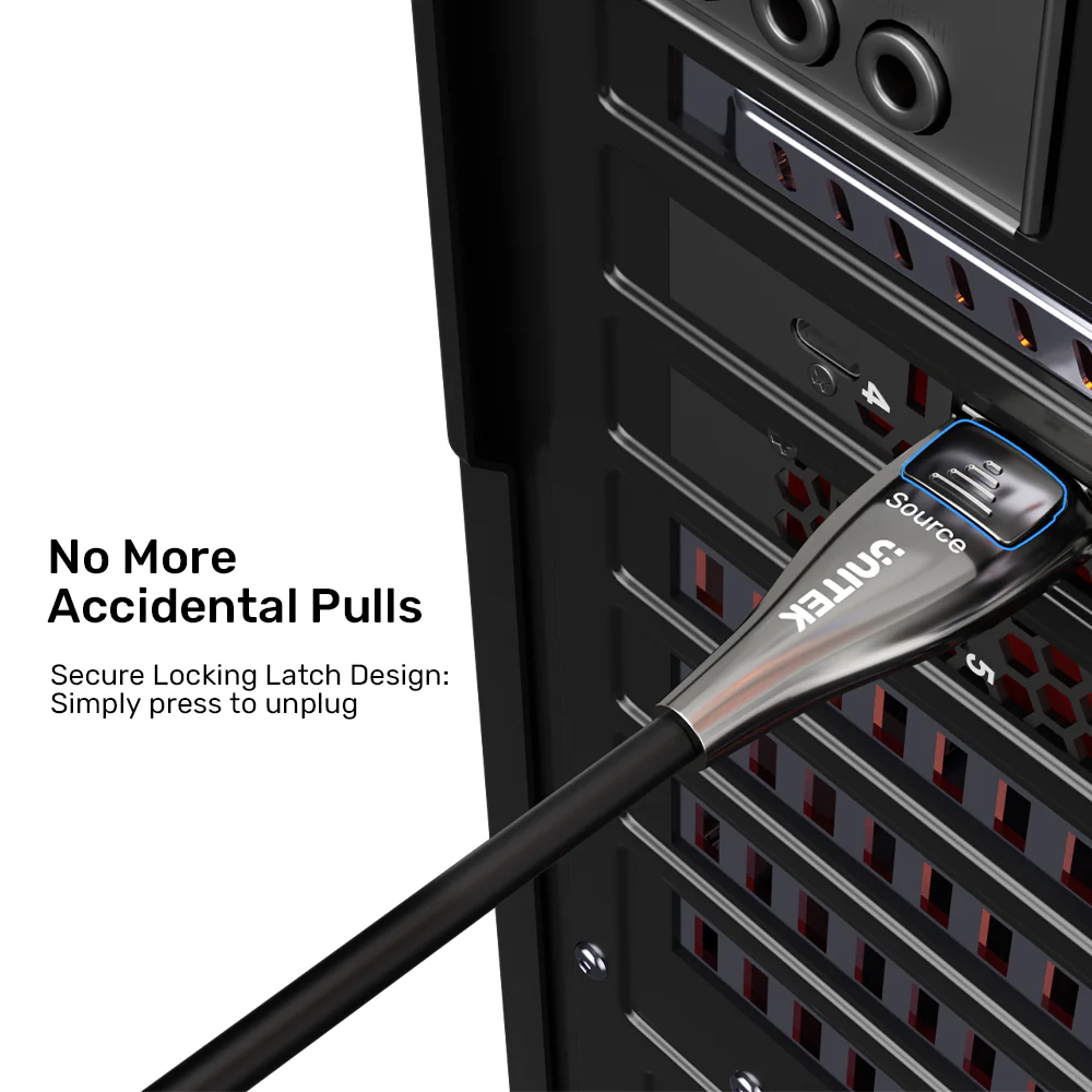 The UNITEK 8K Fiber Optic DisplayPort 2.1 Cable features a secure locking latch design to prevent signal interruptions from accidental tugs, such as from pets or foot traffic. It is easy to use—simply press to unplug. Built with 30AWG tinned copper conductors and triple shielding , it ensures stable, high-speed transmission. The tinplate shielding blocks electromagnetic interference and minimizes signal loss. The gold-plated zinc alloy connectors provide superior corrosion resistance and optimal conductivity. For more durable cables, browse the UNITEK Cat 8 Ethernet Cable.