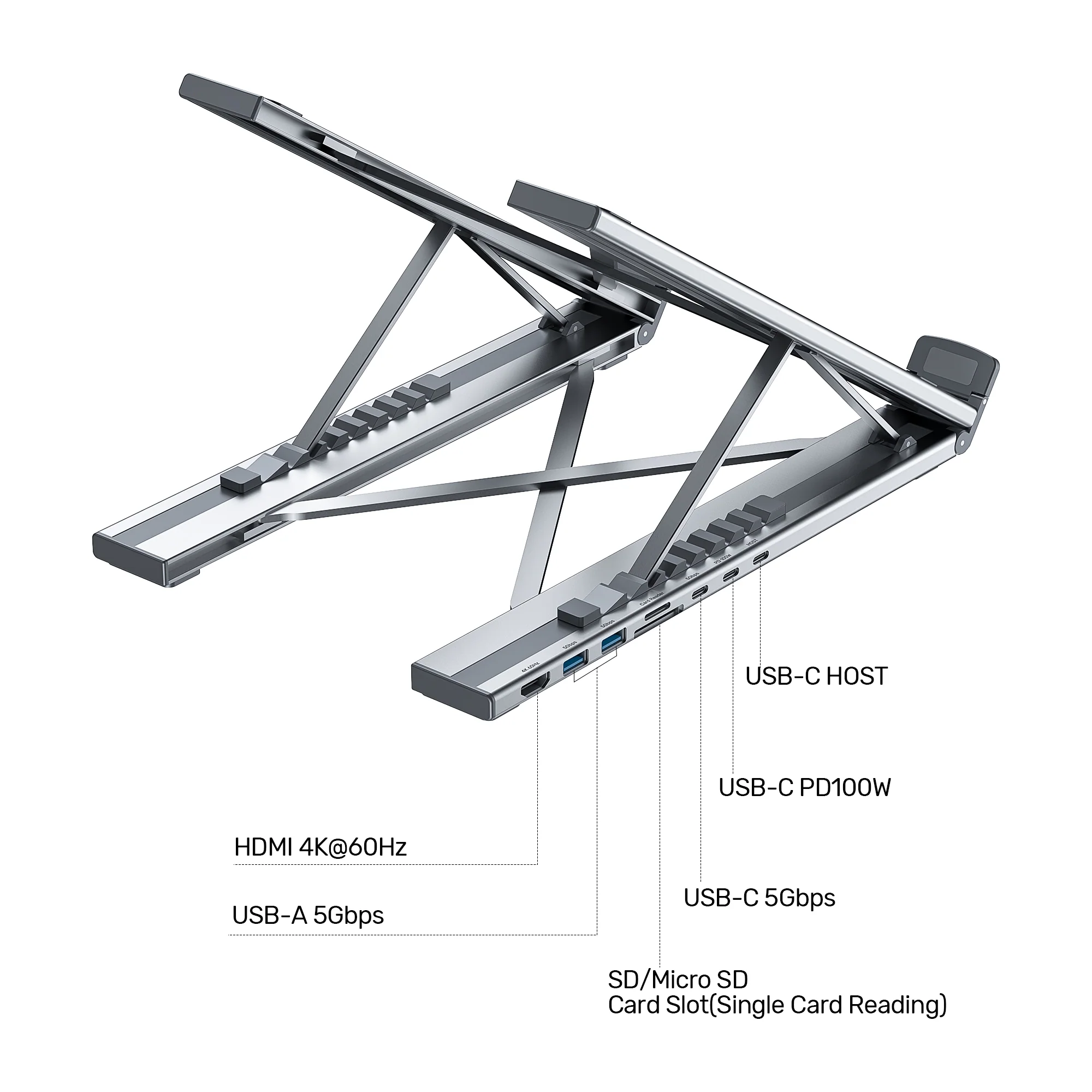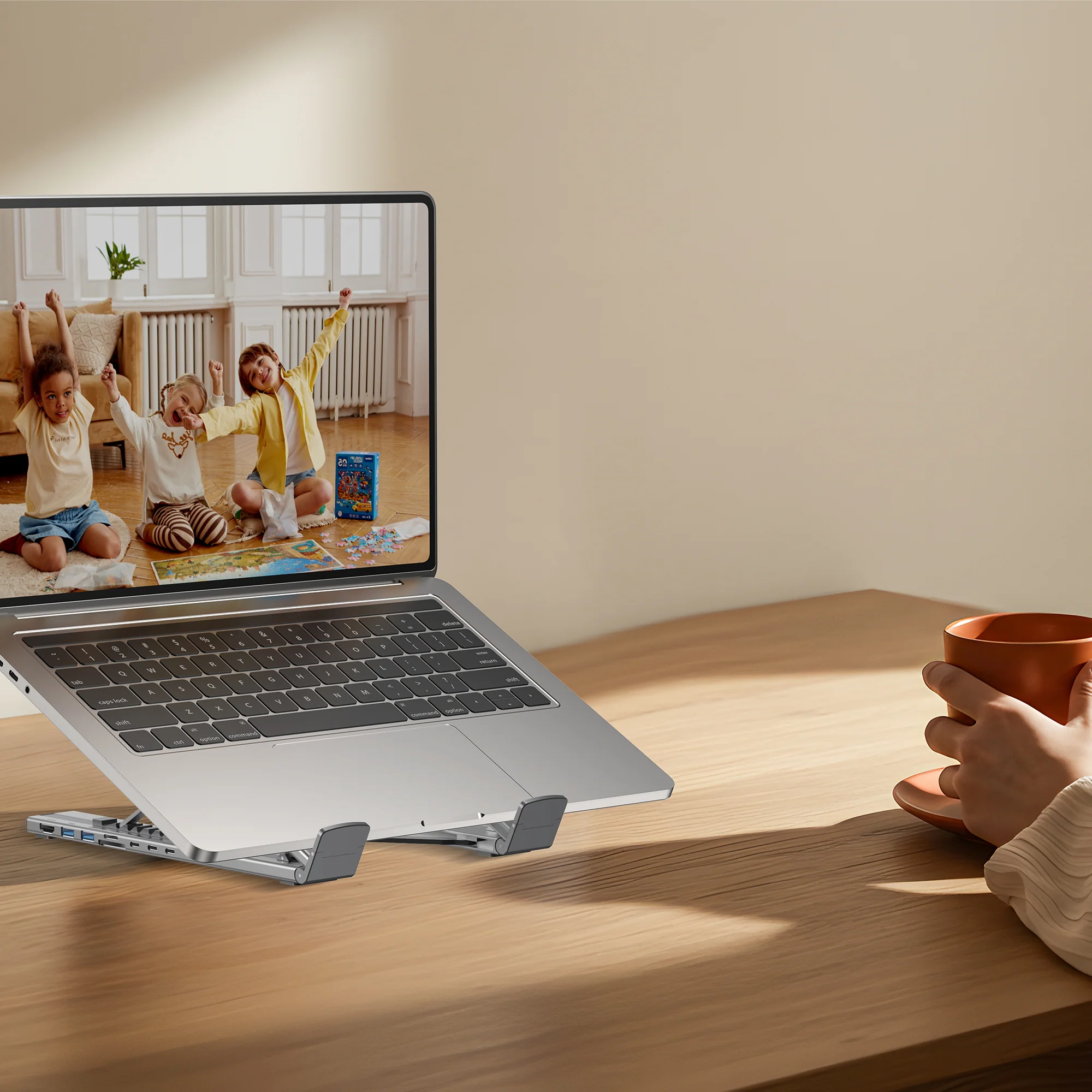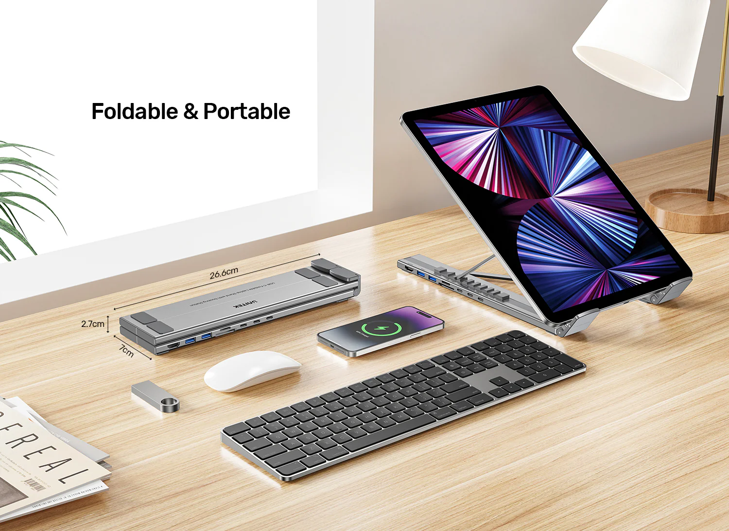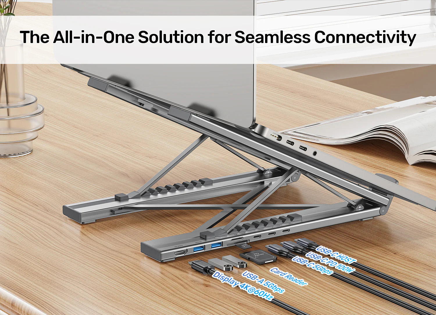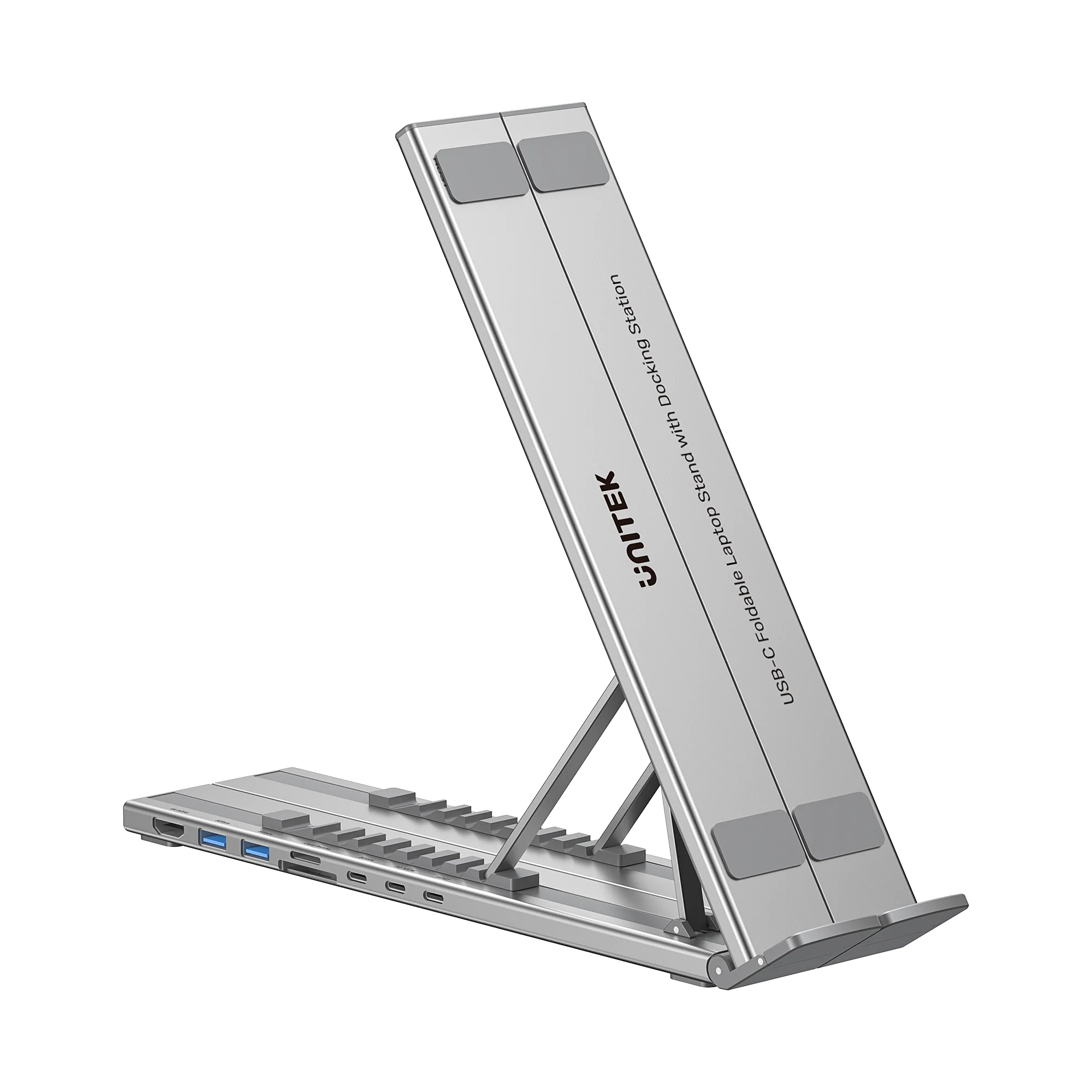UNITEK D1137AGY01 Foldable Laptop Stand with 7-in-1 Docking Station – Aluminum USB-C Stand for MacBook, Laptop, Tablet – 4K HDMI, 100W PD, 5Gbps USB Ports – Ergonomic Adjustable Height – Portable & Lightweight