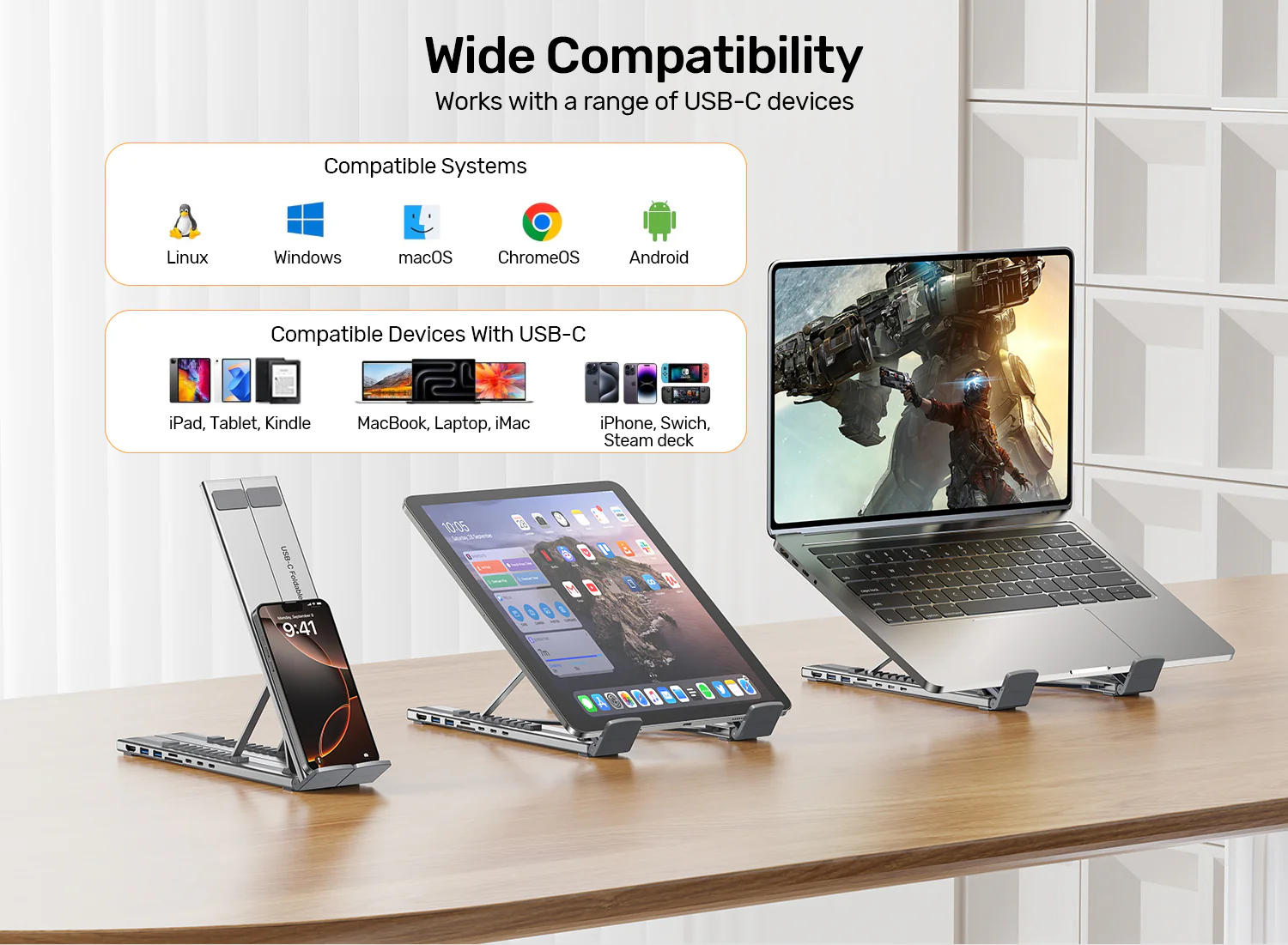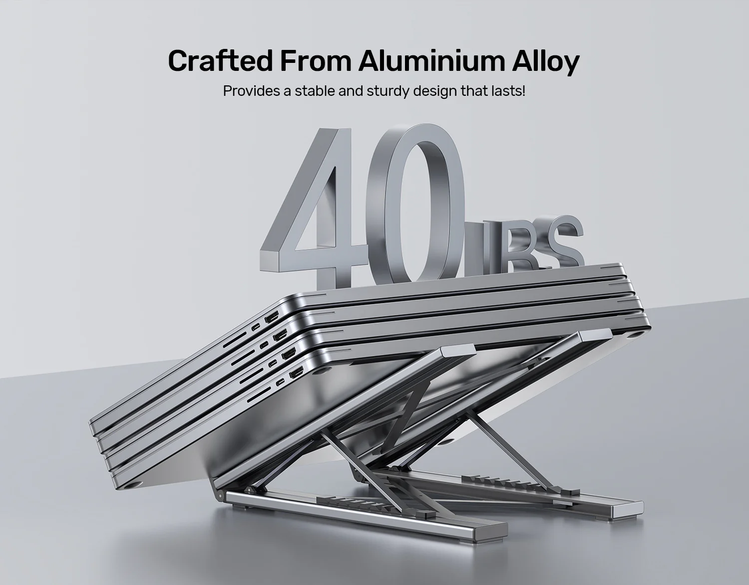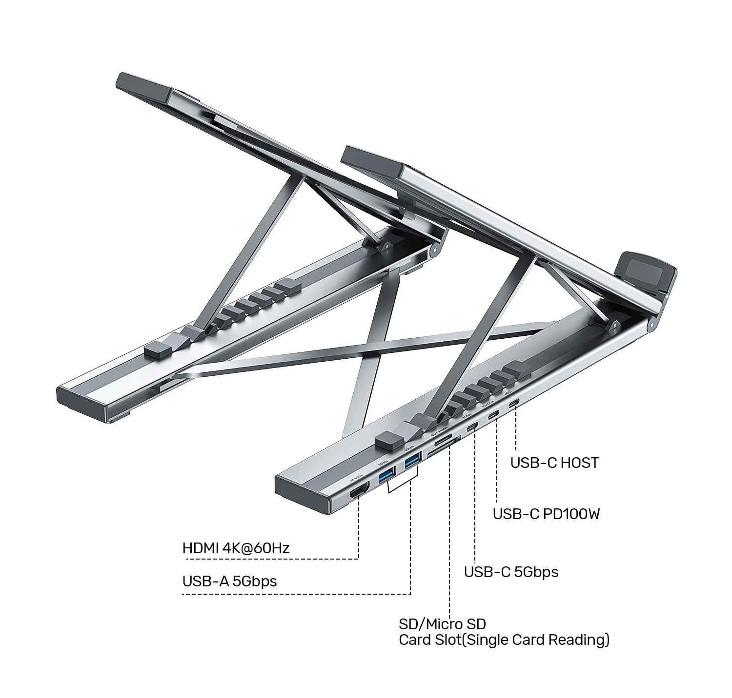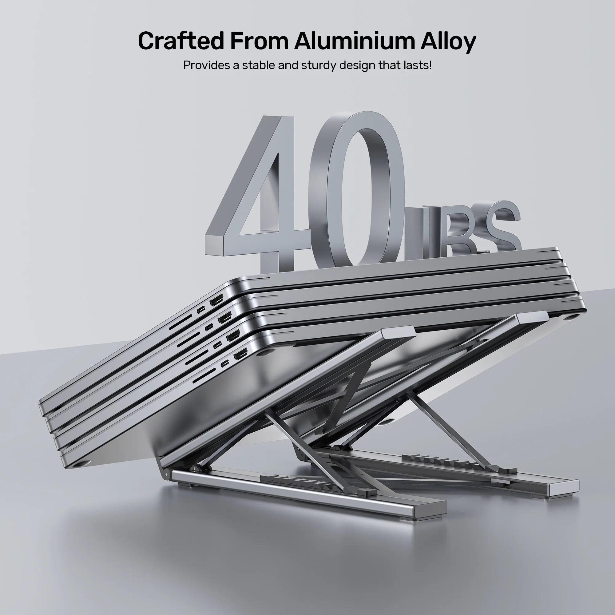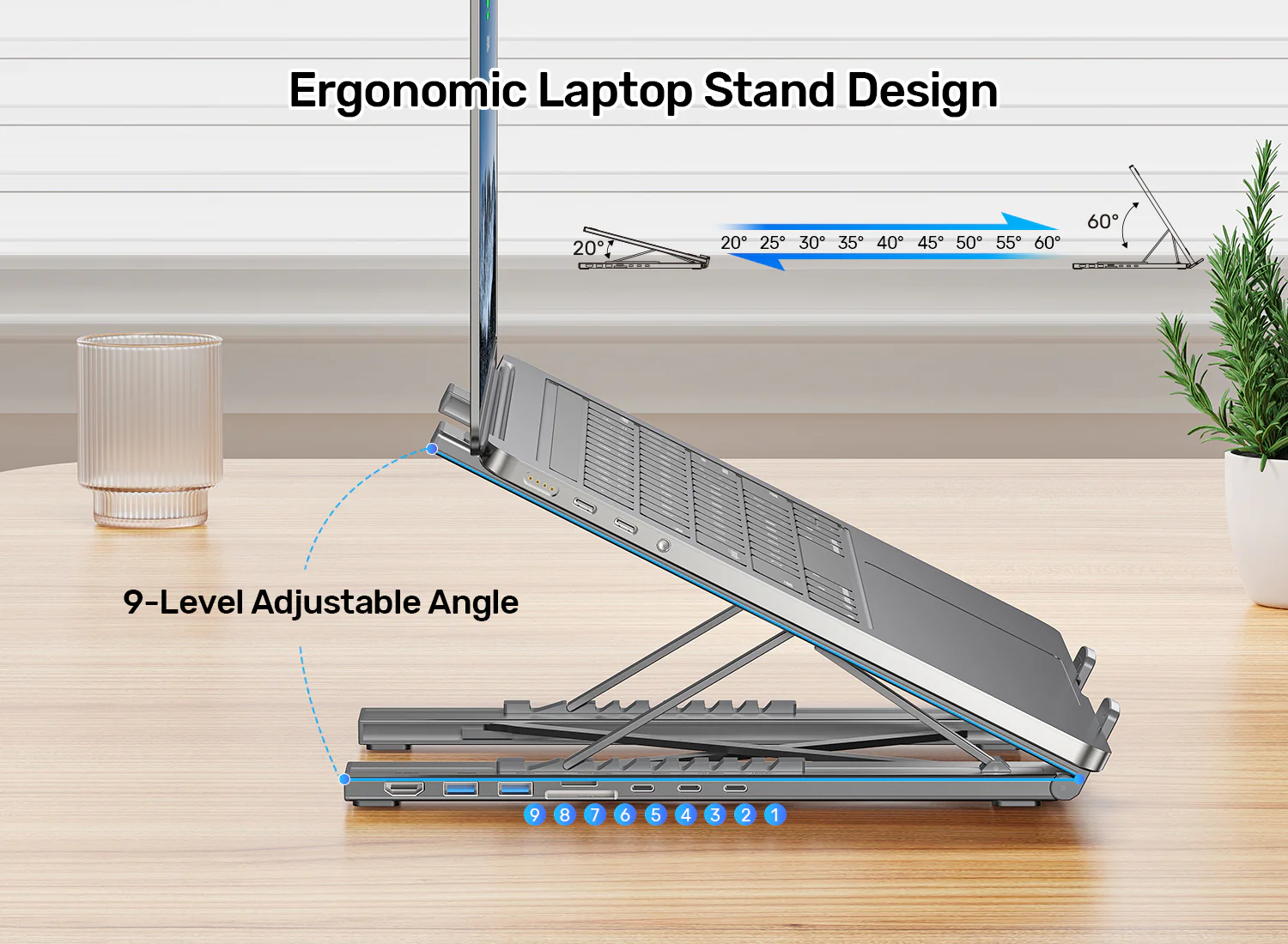 UNITEK D1137AGY01 Foldable Laptop Stand with 7-in-1 Docking Station – Aluminum USB-C Stand for MacBook, Laptop, Tablet – 4K HDMI, 100W PD, 5Gbps USB Ports – Ergonomic Adjustable Height – Portable & Lightweight