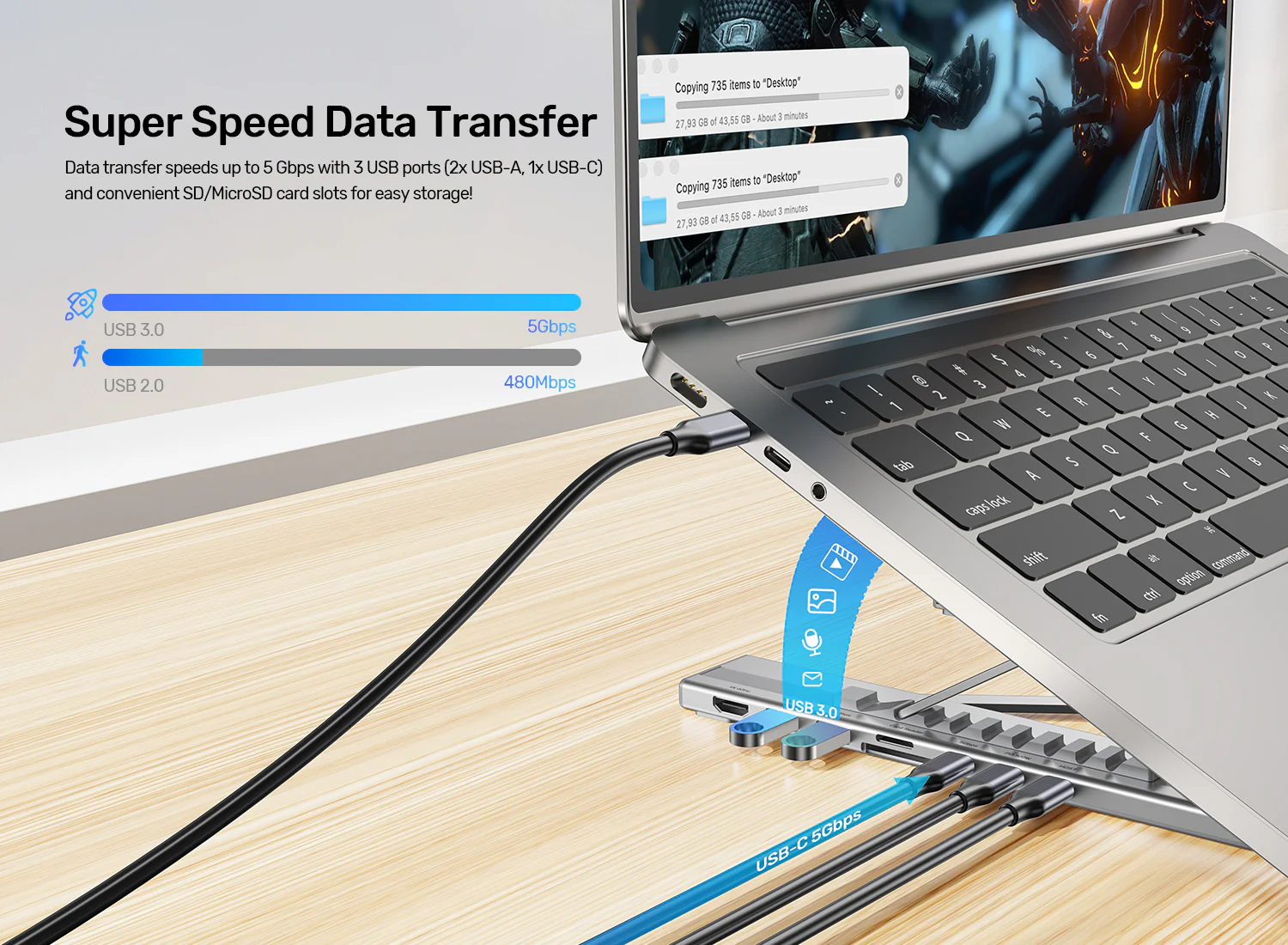 - 3x USB Ports (2x USB-A + 1x USB-C): Transfer files at 5Gbps speeds—10x faster than USB 2.0.