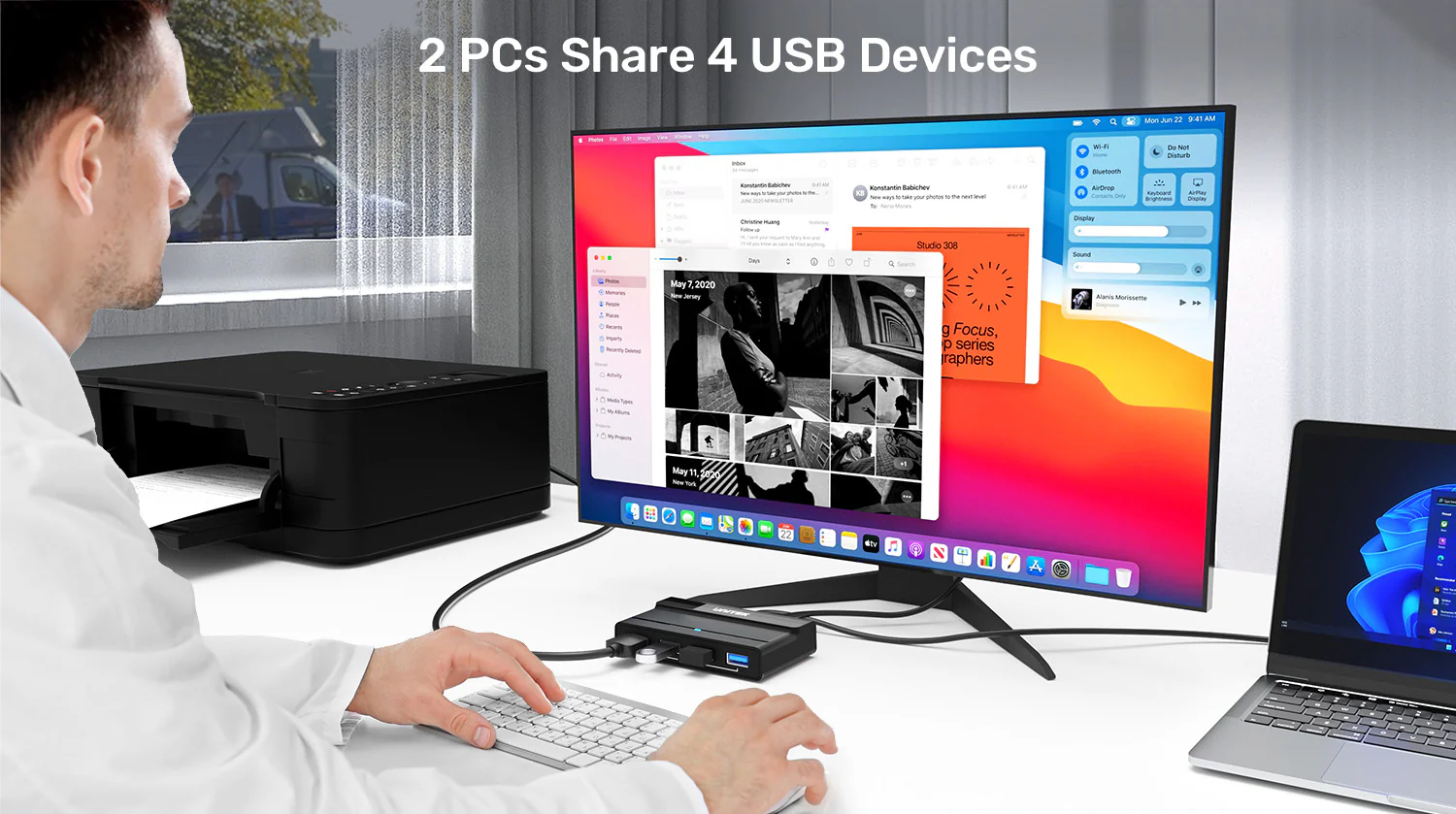 First and foremost, this switch solves a common workspace dilemma. Connect your keyboard, mouse, webcam, and printer to the hub, then connect the hub to two computers. With a single button press, you transfer control of all four devices from one computer to the other. This is ideal for home office professionals and developers who use multiple machines.