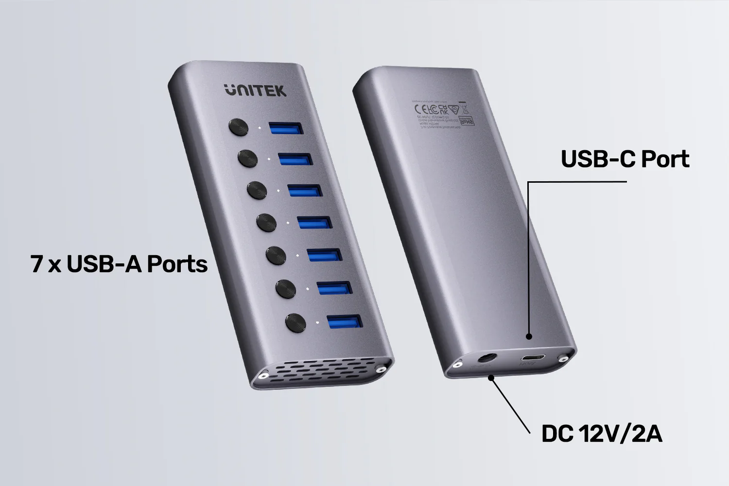 UNITEK H1314A01-EU 7-in-1 USB Hub with Individual Port Switches, 7x USB-A 5Gbps + BC1.2 Fast Charging, Aluminum Powered Hub for PC, Laptop, Workstation