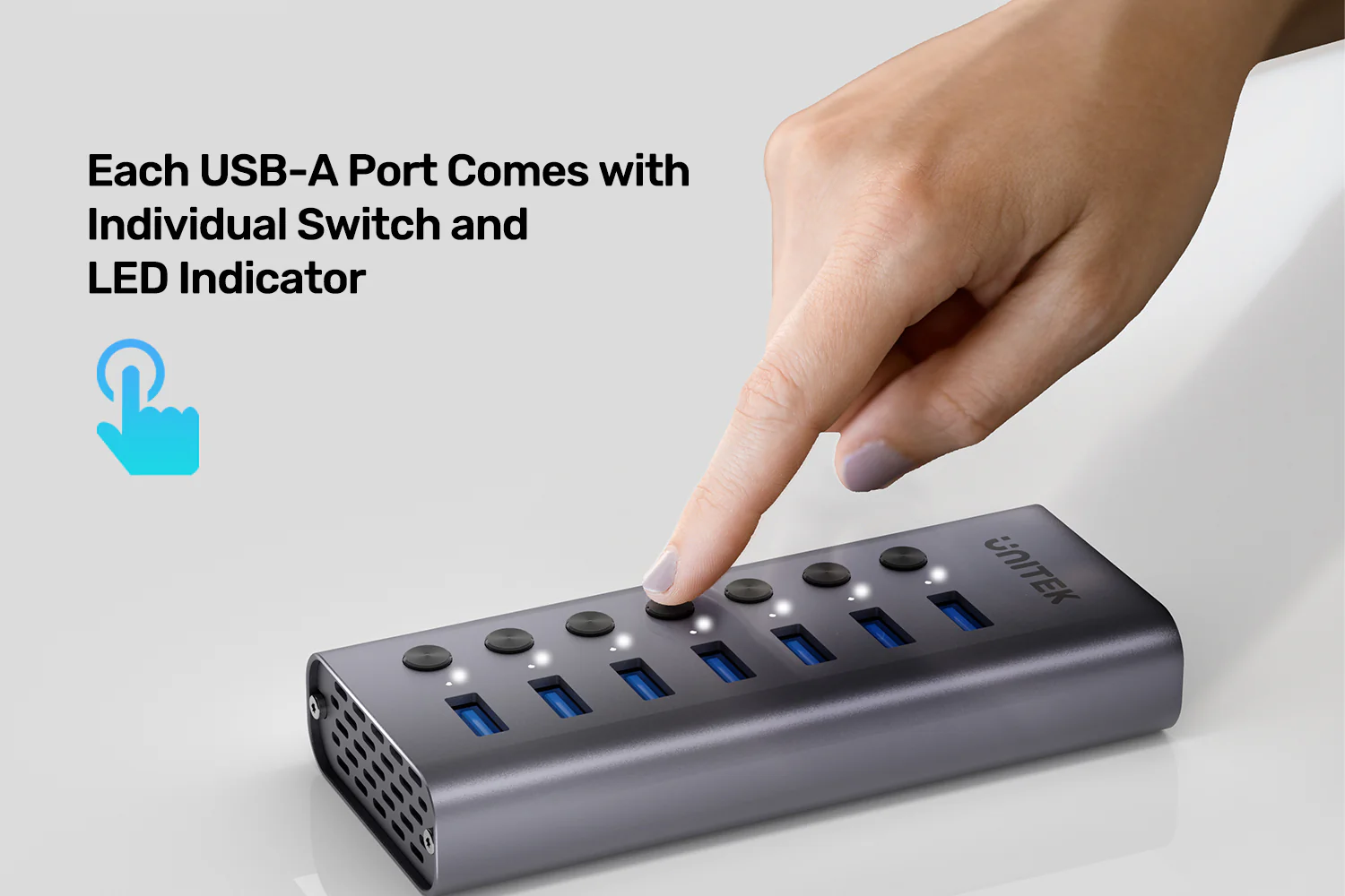 Take command of your desktop connectivity. The UNITEK H1314A 7-in-1 Hub is more than just a port expander; it’s a managed connectivity center designed for power users, professionals, and IT administrators. With its unique individual port switches, dedicated high-power supply, and fast charging capability, it delivers unparalleled control and performance for the most demanding setups.