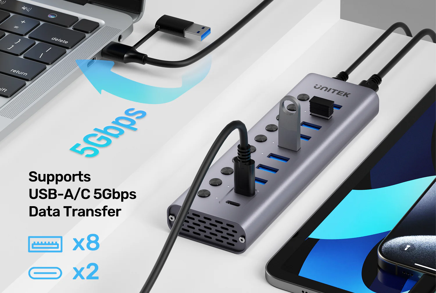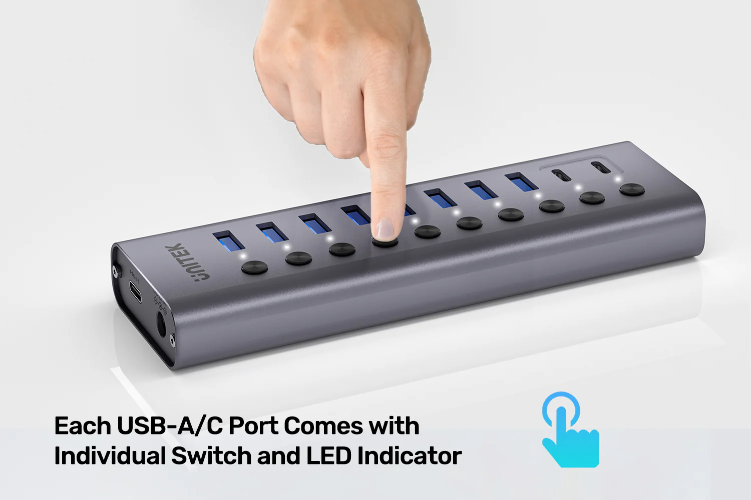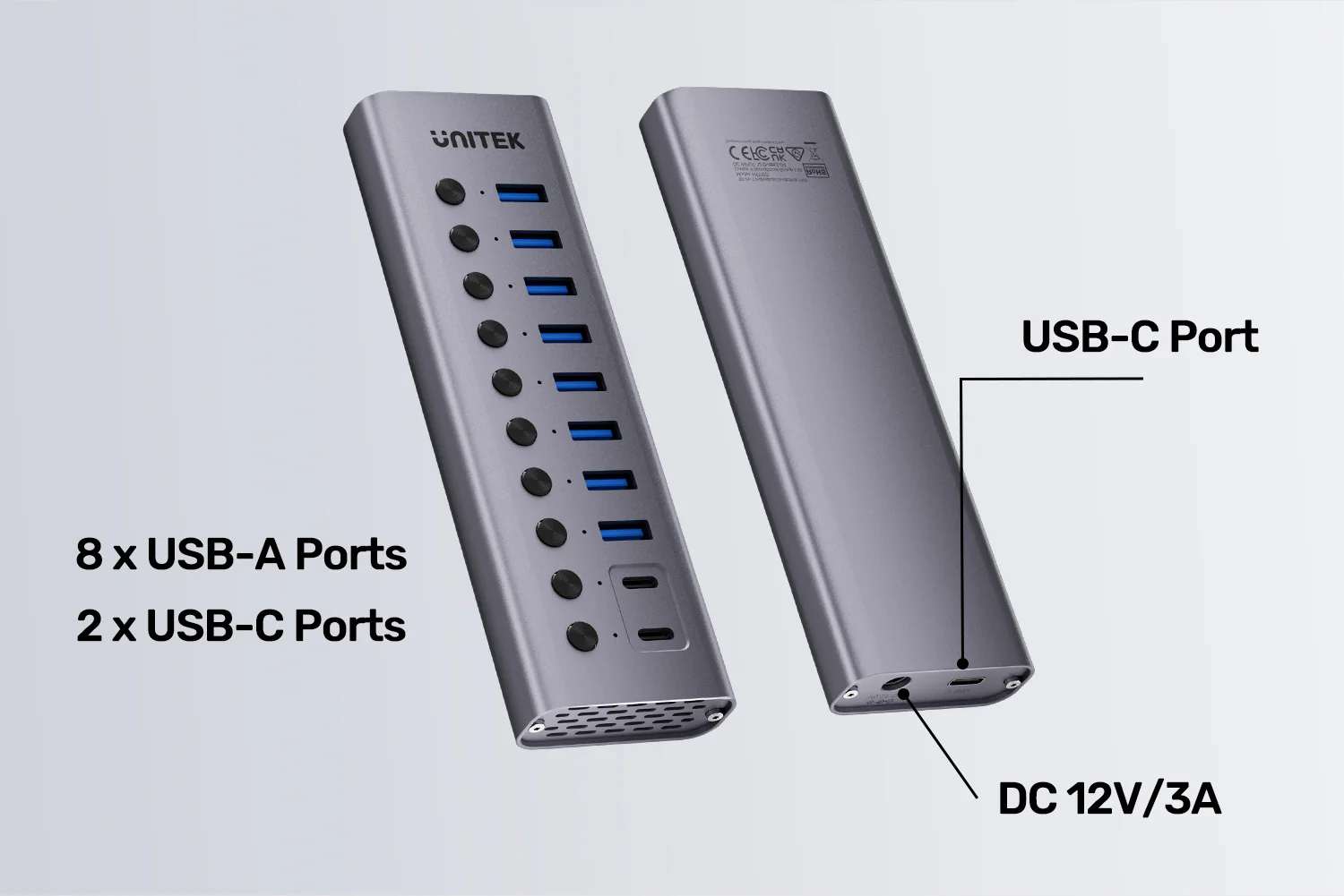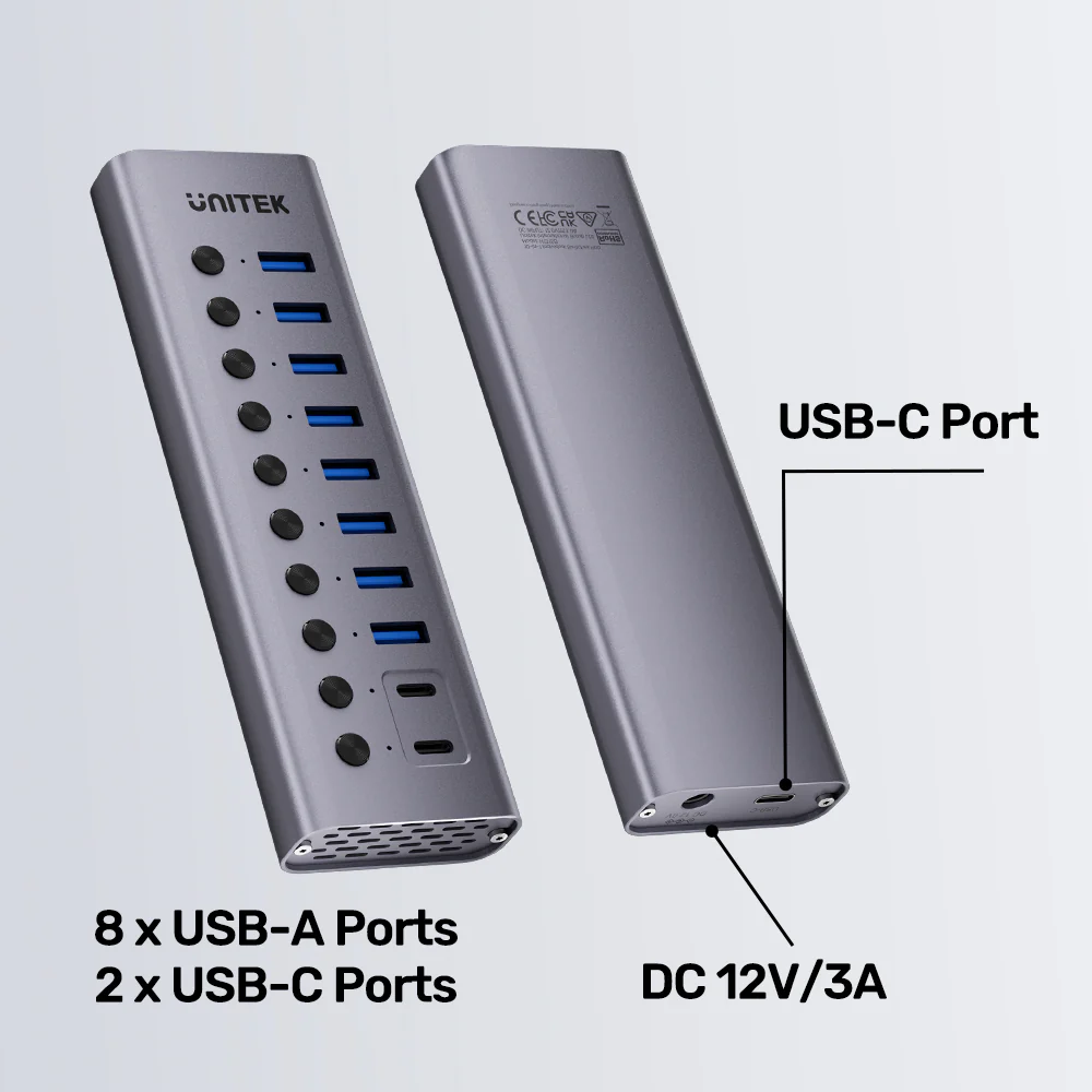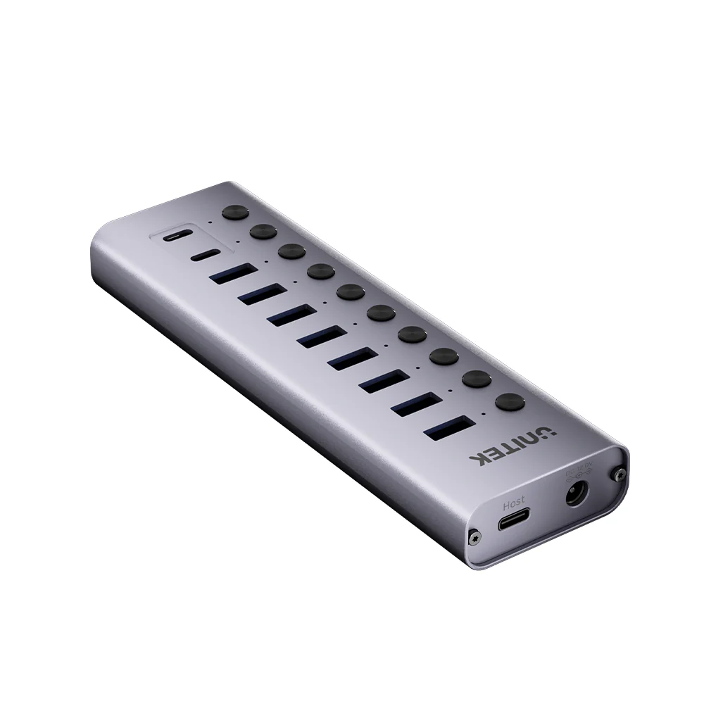 UNITEK H1315B01-EU 10-in-1 USB Hub with Individual Port Switches, 8x USB-A + 2x USB-C 5Gbps with BC1.2 Fast Charging, Aluminum Powered Hub for PC, Mac, Workstation