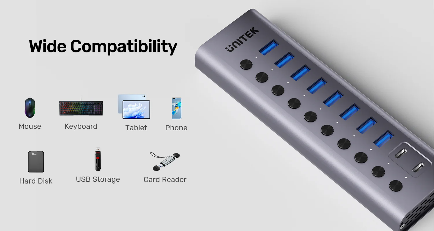 Command the most complex device ecosystems with precision. The UNITEK H1315B 10-in-1 Hub is the pinnacle of managed USB expansion, designed for IT professionals, content creators, and power users who need absolute control over a vast array of peripherals. With individual switches for every port, a massive 36W power supply, and a future-proof mix of USB-A and USB-C ports, it’s the definitive hub for mission-critical setups.