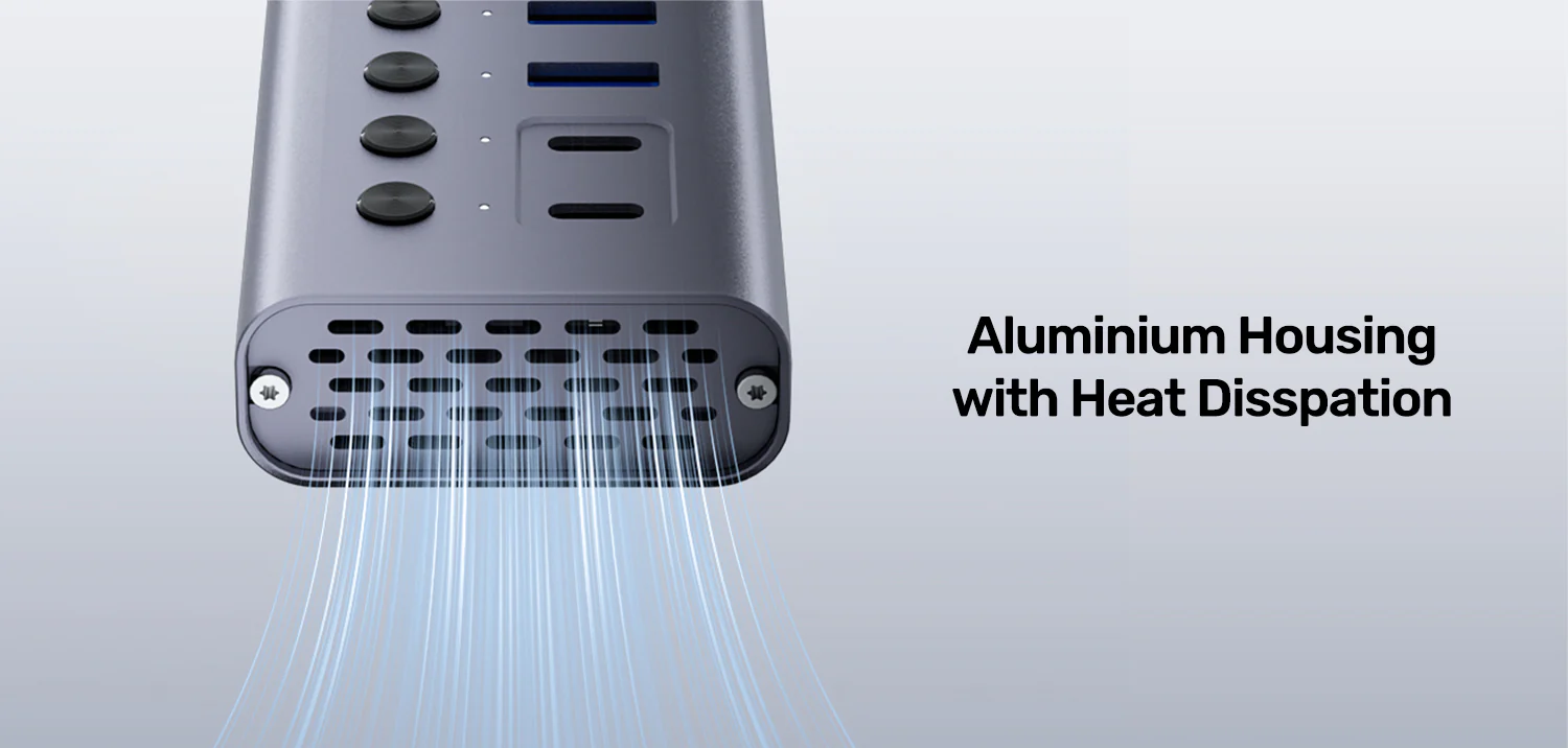 The extended aluminum chassis provides a large surface area for passive cooling, which is vital when all ports are active under full load. Coupled with the high-quality, regulated power supply, this hub is built not just for convenience, but for durability and unwavering stability, making it the core of any professional editing bay or engineering workstation.