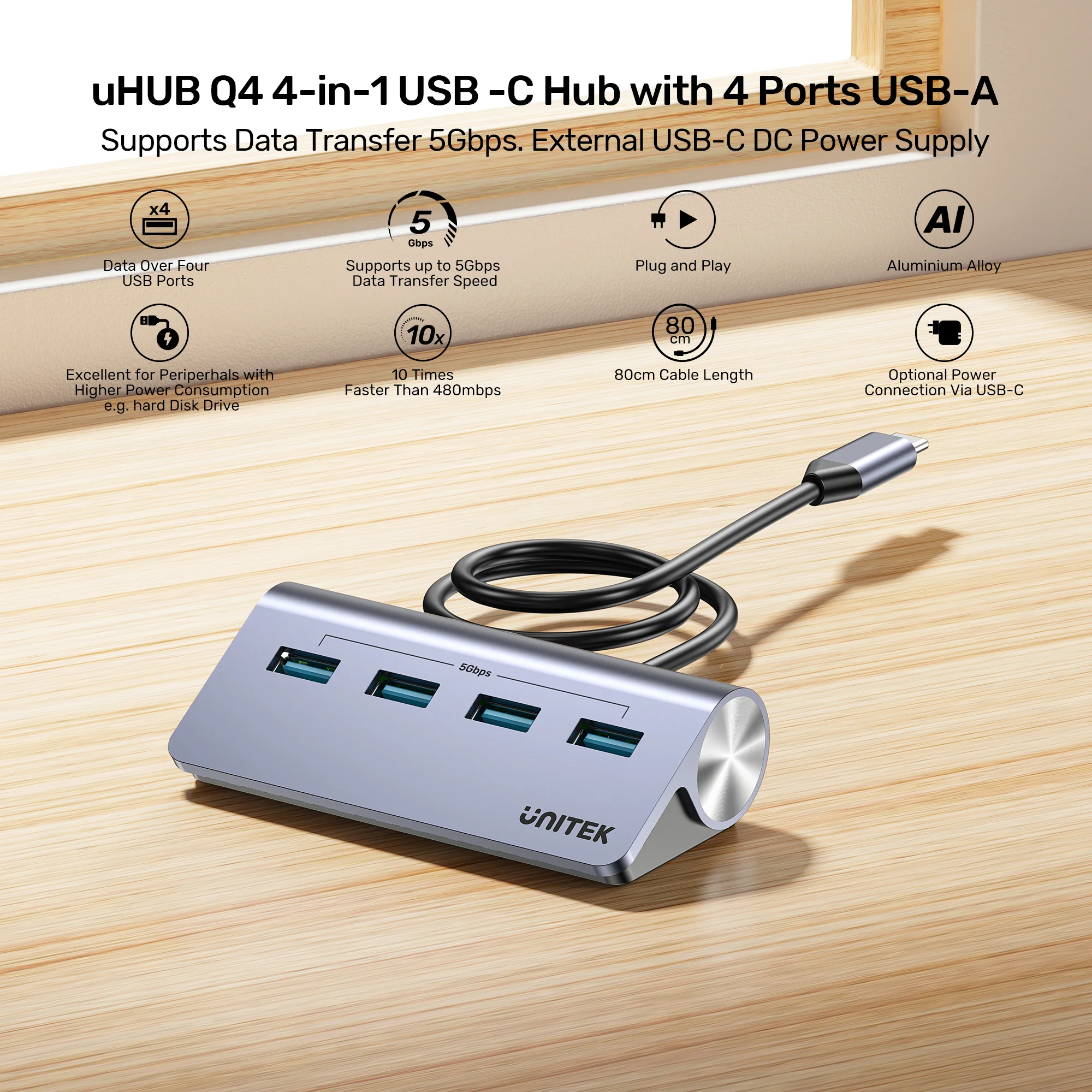 UNITEK H1337BGY01 uHUB Q4 4-in-1 USB-C Hub, 4x USB-A 5Gbps Data Ports with External Power, 33° Angled Aluminum Design for MacBook, Windows Laptop, iPad Pro