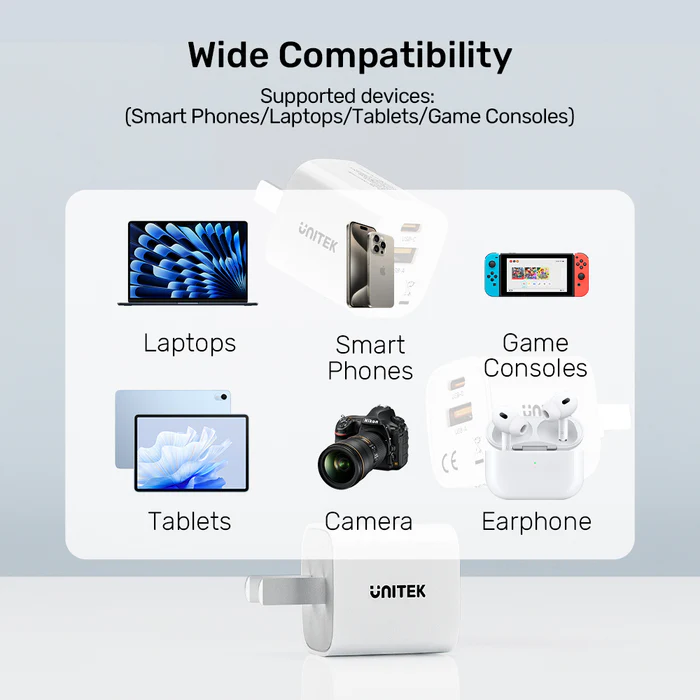 The UNITEK 33W Mini USB Wall Charger delivers powerful charging in an ultra-compact design. Featuring both USB-C Power Delivery and USB-A Quick Charge 3.0 ports, this charger can power up your iPhone to 60% in just 30 minutes while simultaneously charging another device.