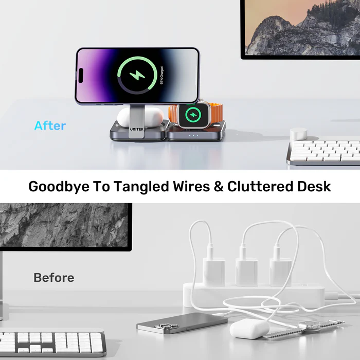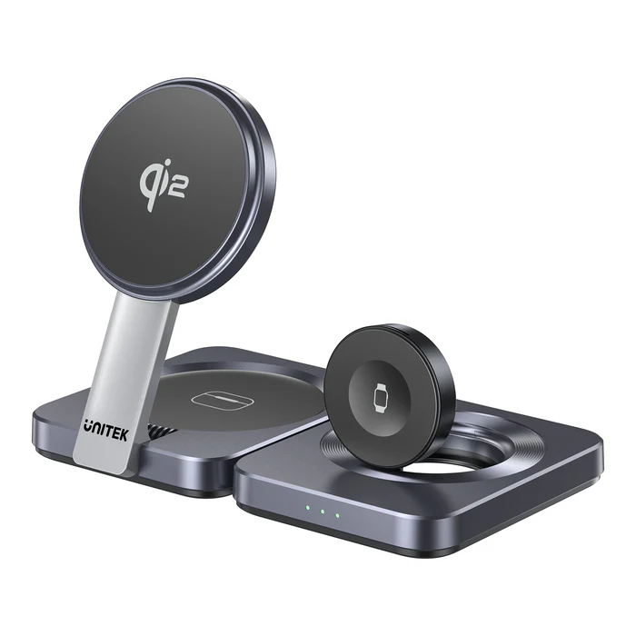 The UNITEK Qi2 Foldable 3-in-1 Charging Station combines powerful wireless charging with ultimate convenience in a sleek, travel-friendly design. Featuring Qi2 certification, it delivers 15W fast wireless charging for your iPhone while simultaneously powering your Apple Watch and AirPods.