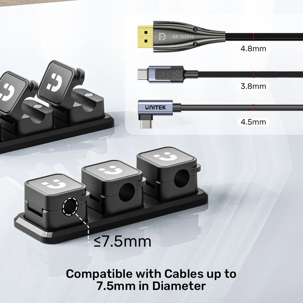 A: The ultra-strong magnets can securely grip cables up to 7.5mm in diameter. This includes standard USB-C cables (4.8mm), HDMI cables (4.5mm), 8K HDMI cables (4.8mm), charging cables (3.8mm), and Ethernet cables (4.5mm). For guaranteed authenticity, always purchase from the UNITEK Pakistan Official Store.