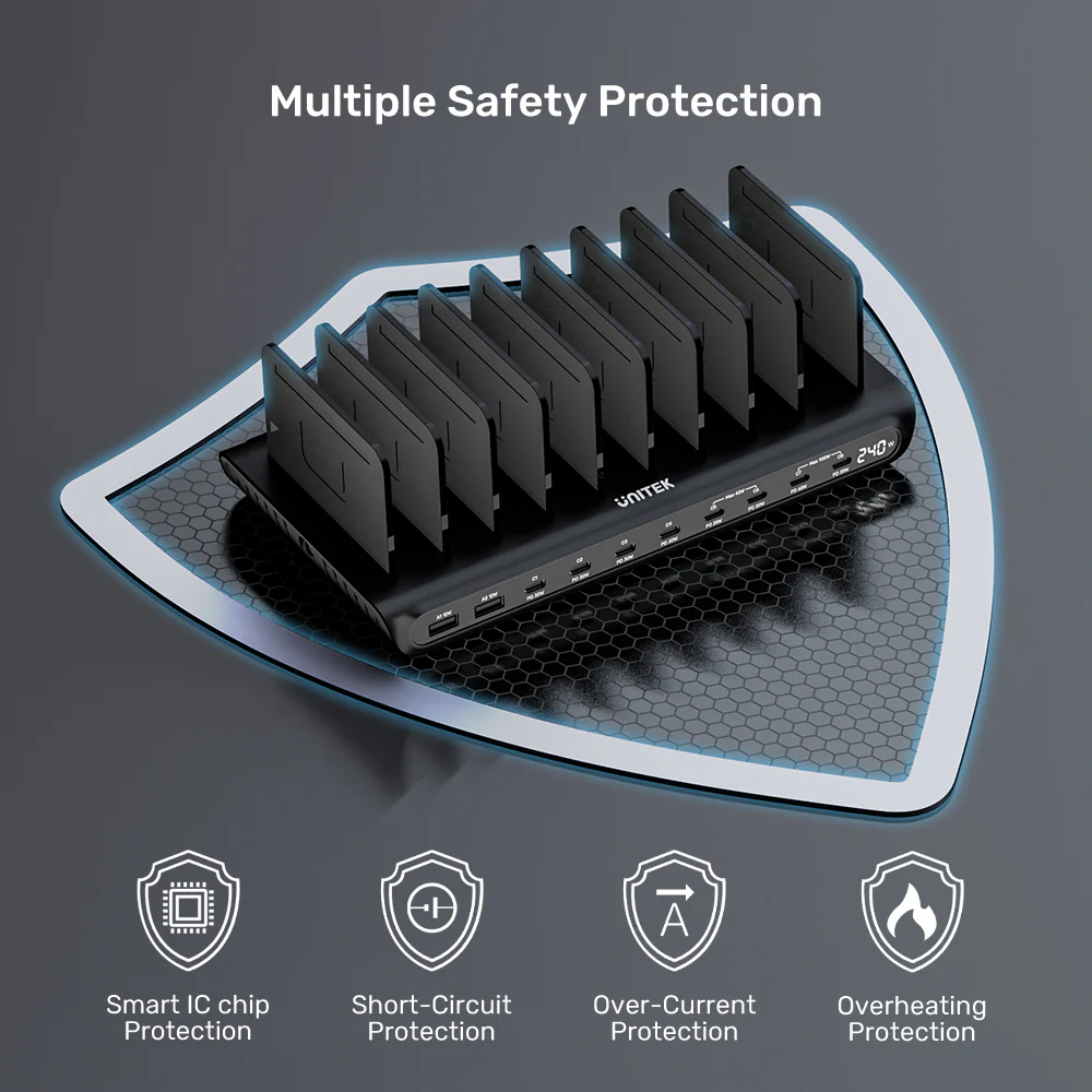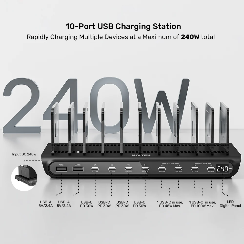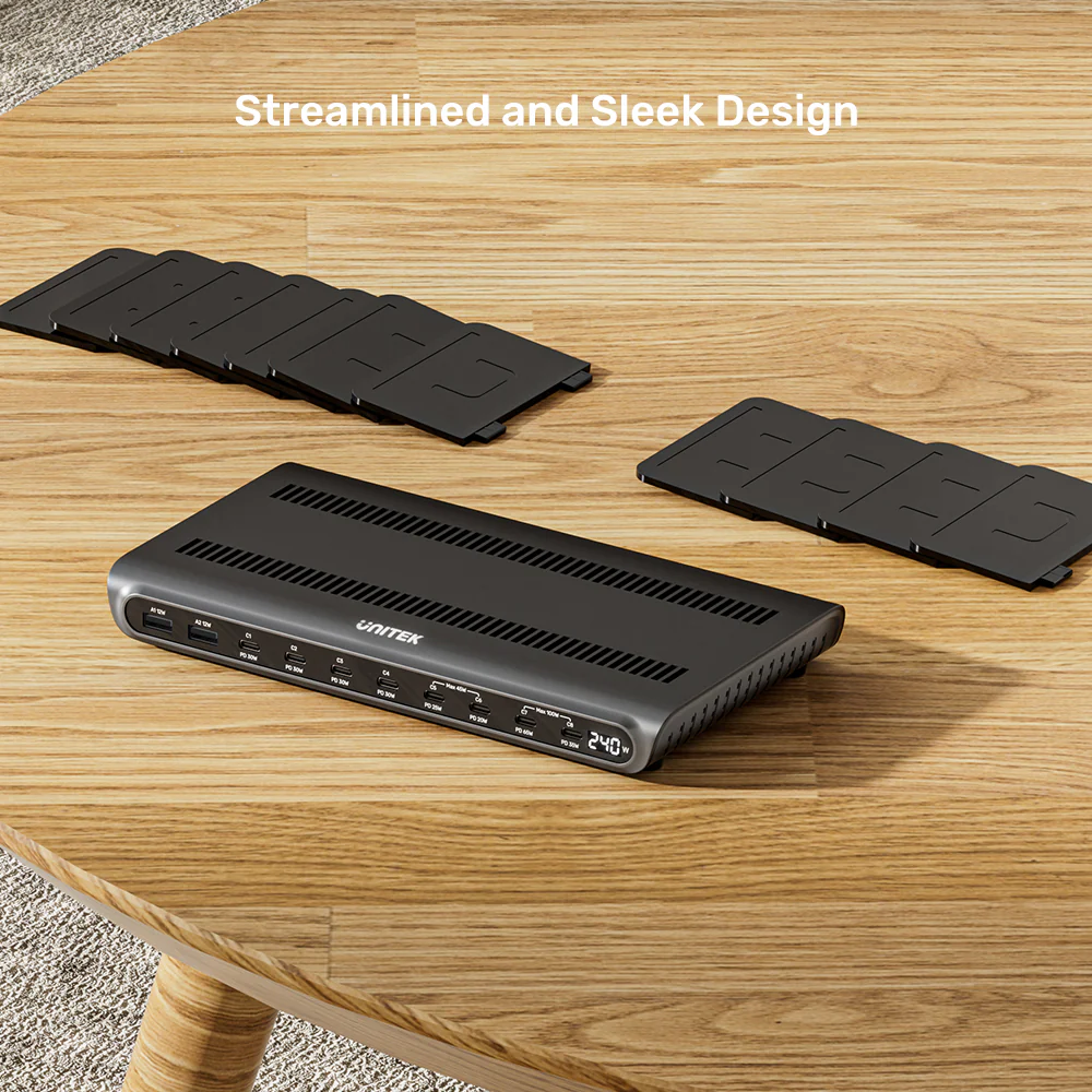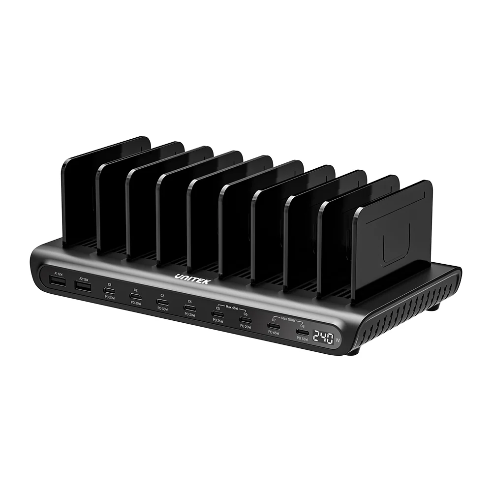 Eliminate cable chaos and charge your entire family’s or team’s devices in one centralized, ultra-efficient spot. The UNITEK uCharge 240W 10-Port Smart Charging Station is the ultimate organizational and power solution for homes, offices, cafés, and schools. It combines high-power delivery, intelligent management, and a sleek design to keep all your gear powered and orderly.