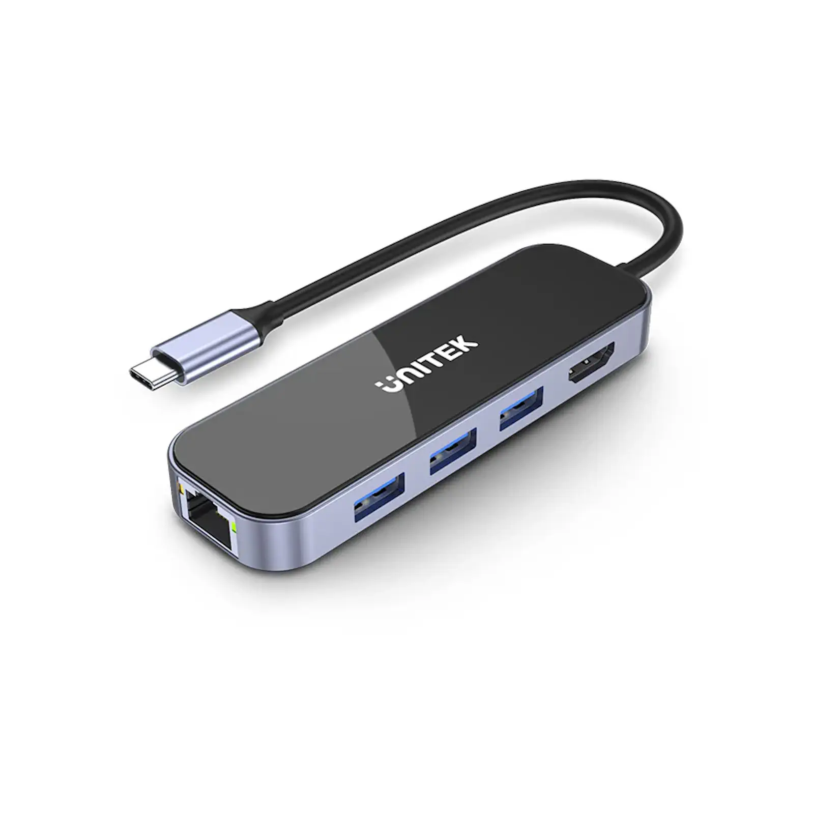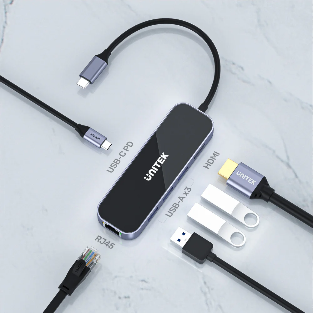 UNITEK D1084A uHUB H6 Gloss 6-in-1 USB-C Hub – HDMI 4K@30Hz, 3x USB-A 3.0, Gigabit Ethernet, 100W PD, Aluminum-Alloy Frame, Compatible with Laptops, Tablets, and More (Black & Space Grey)