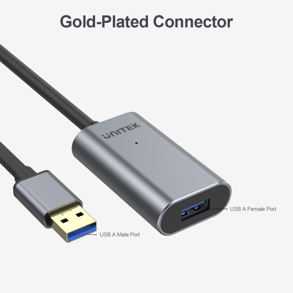 UNITEK Y-3005 USB 3.0 Extension Cable with Signal Booster & Aluminium Housing, Gold-Plated Connector, DC Jack, 5Gbps High-Speed Data Transfer, Backward Compatible with USB 2.0/1.1, Durable and Reliable for PC, Laptop, and More
