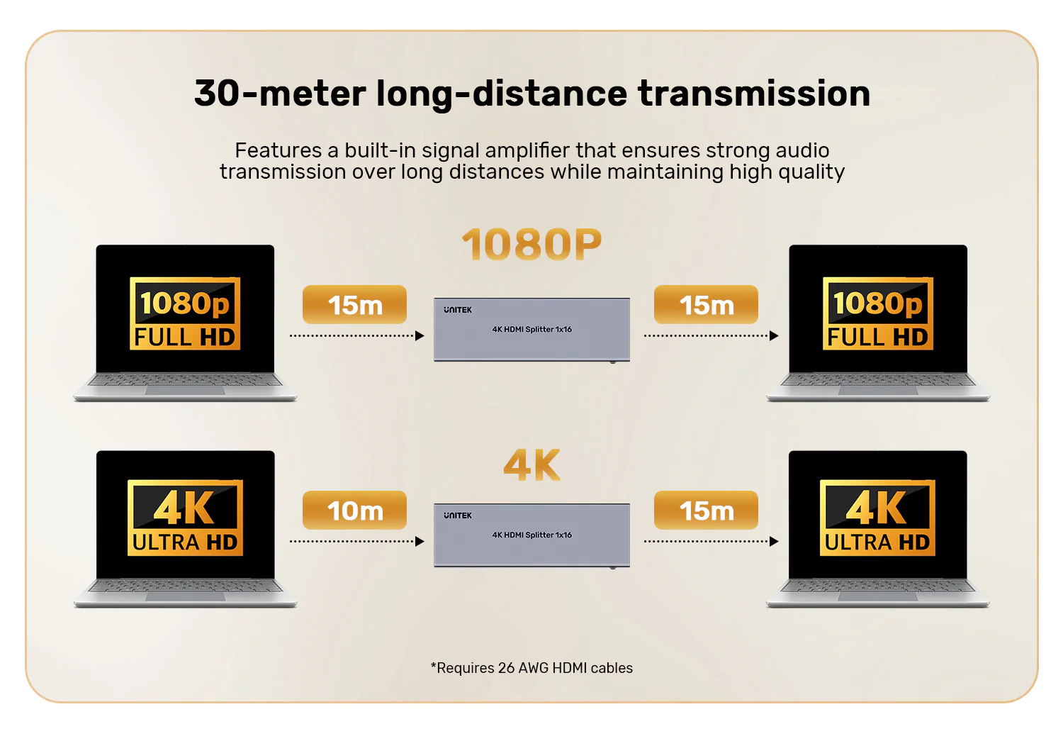 - Max Transmission Distance: 4K: 10m Input / 15m Output | 1080p: 15m Input / 15m Output*