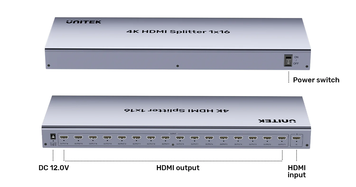 Command attention across every screen in the room with the UNITEK 1-in-16 HDMI Splitter. This industrial-grade video distribution unit is engineered for clarity, reliability, and scale, transforming one video source into a synchronized multi-display experience perfect for digital advertising, education, worship, and command centers.