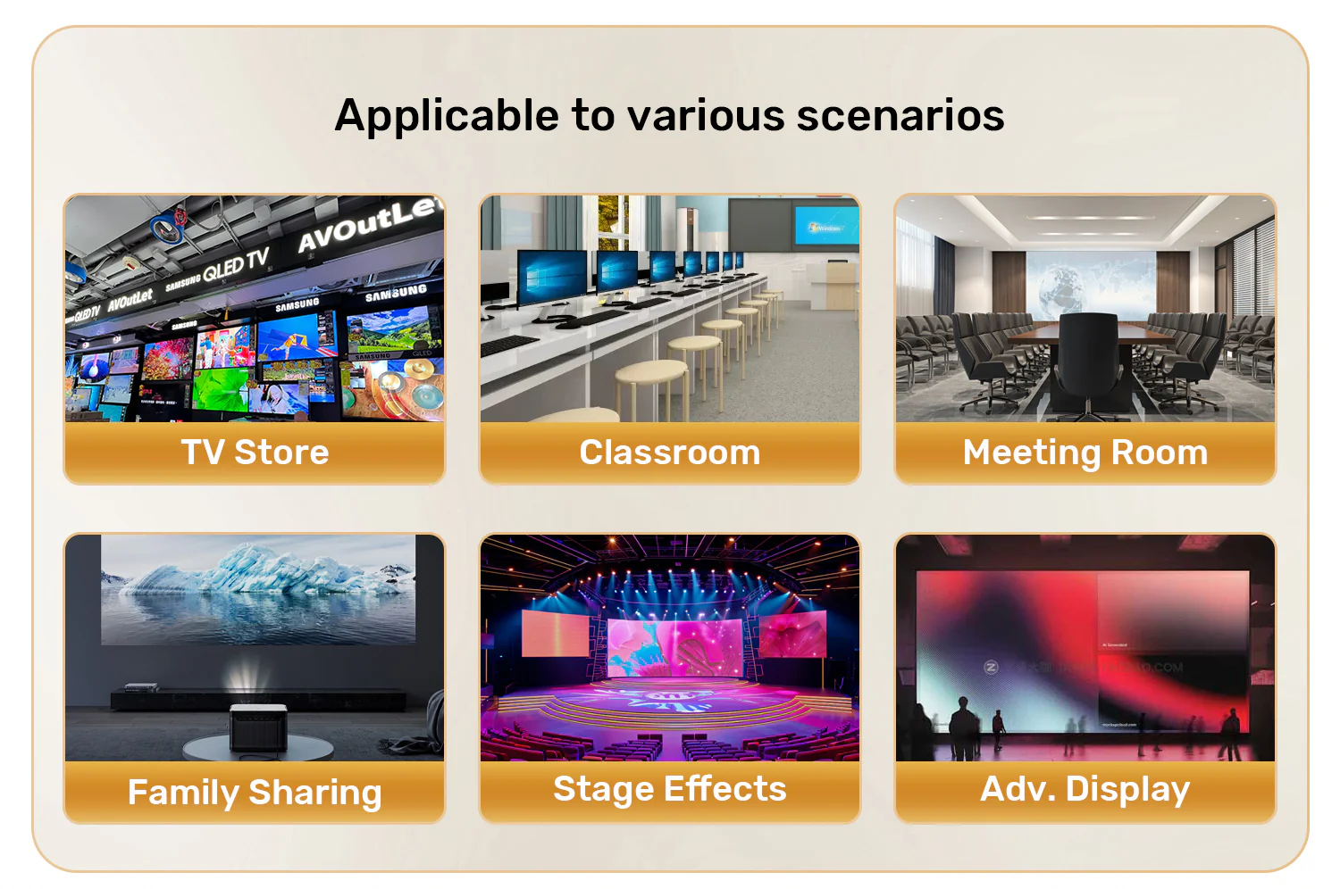 Typical applications include: Digital Signage in retail stores, Video walls in control rooms, Live event broadcasting to multiple monitors, Lecture capture in schools/universities, and Content distribution in houses of worship.