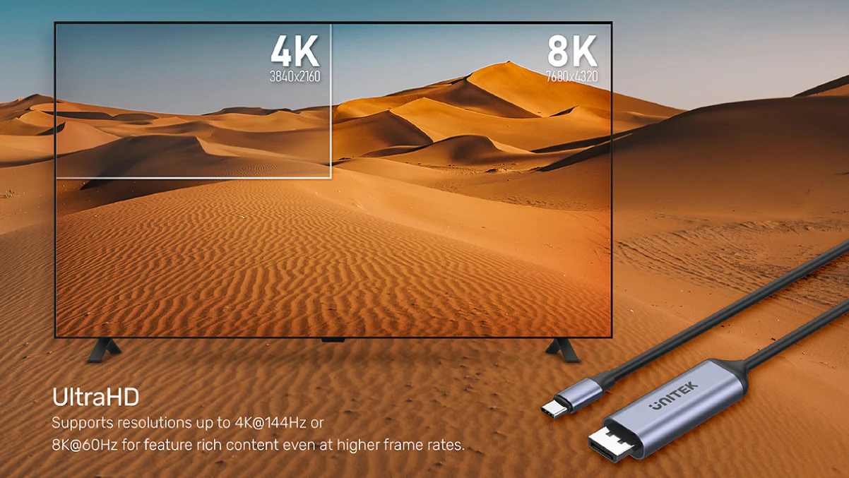 Engineered for professionals and power users, the UNITEK V1423C delivers uncompromising 8K resolution or ultra-smooth 4K@144Hz gameplay through cutting-edge DisplayPort 1.4 technology. The active conversion chipset ensures perfect signal integrity across the entire 1.8-meter cable length.