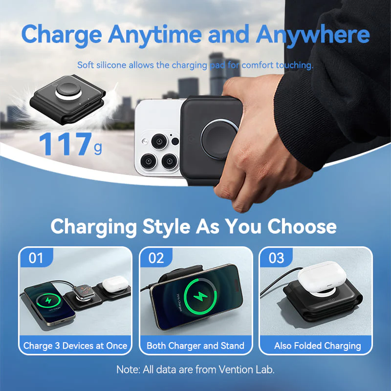 VENTION FGGB0 3-in-1 MagSafe Wireless Charger with LED Night Light – 15W Fast Charging Pad for iPhone 14/15, Apple Watch, AirPods – Foldable Silicone Design & Stepless Dimming (Black)