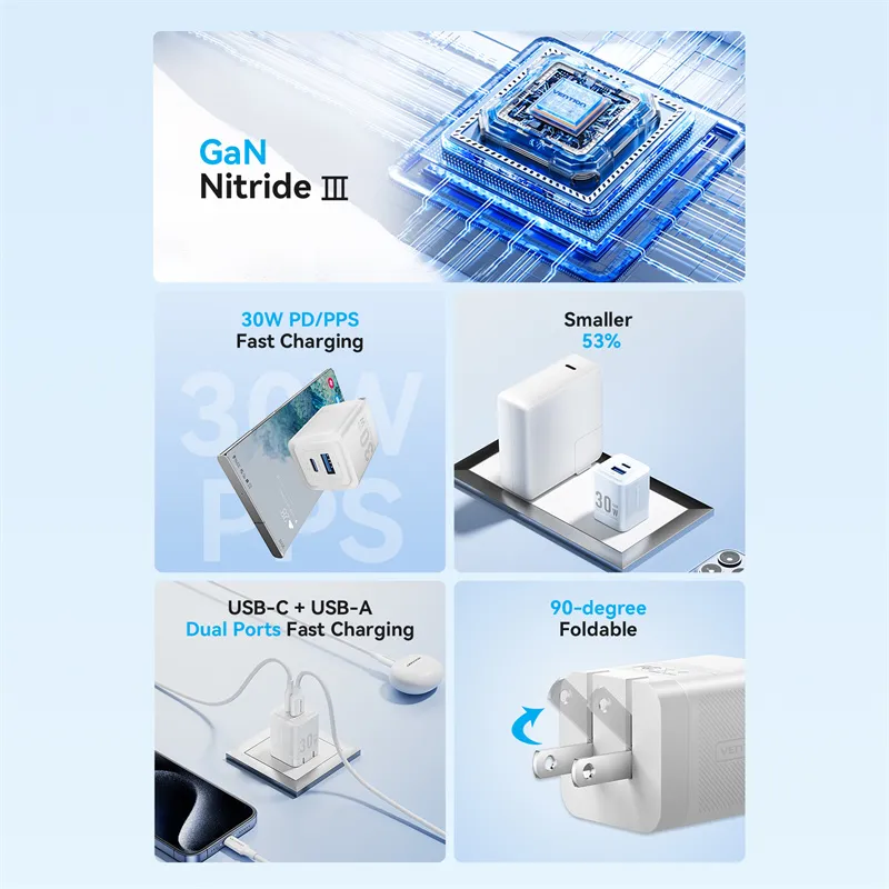 - 53% smaller size than conventional 30W chargers (just 2.8×2.8×3.6cm)