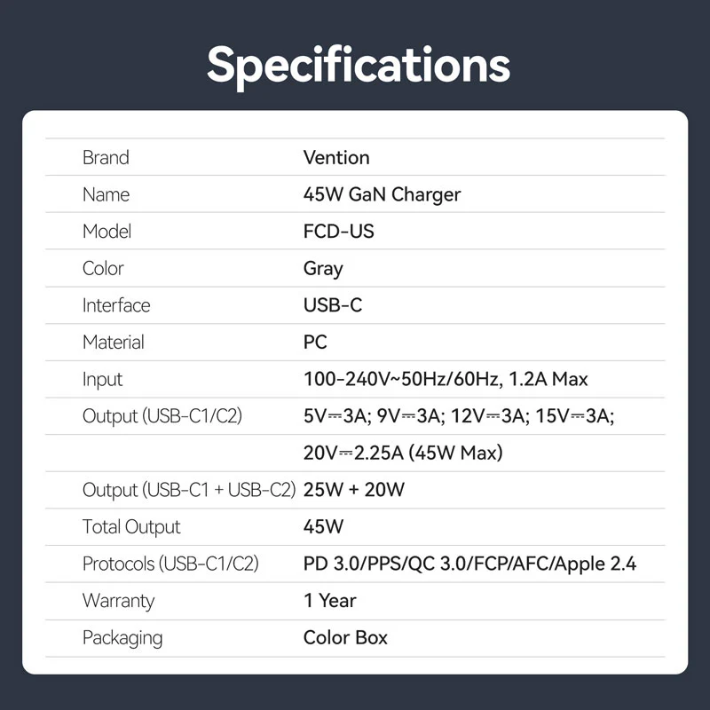 - Output (Single Port): 5V/3A, 9V/3A, 12V/3A, 15V/3A, 20V/2.25A (45W Max)