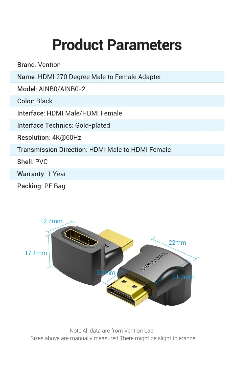 VENTION AINB0 HDMI 270° Male to Female Adapter (Black) – 4K@60Hz Ultra HD – Gold-Plated Connector – Flexible Rotation – Compatible with Laptop, TV, Monitor – 1 Year Warranty