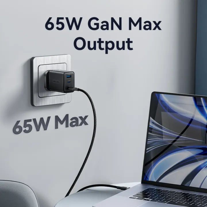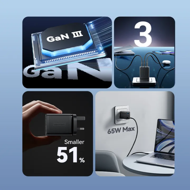 The Vention FERB0-UK 65W GaN 3-Port USB-C Fast Charger is a powerful and compact charging solution for all your devices. Equipped with advanced GaN technology, this charger offers higher efficiency, faster charging, and better heat dissipation compared to traditional power adapters.