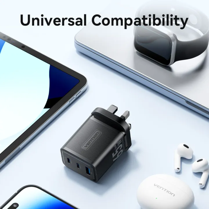 VENTION FERB0-UK 65W GaN 3-Port USB-C Fast Charger (UK Plug) | Quick Charge 4.0 & PD 3.0 | USB-C & USB-A Charger for iPhone 16/15/14 Pro Max, Samsung S25/S24 Ultra, MacBook, Dell XPS & More