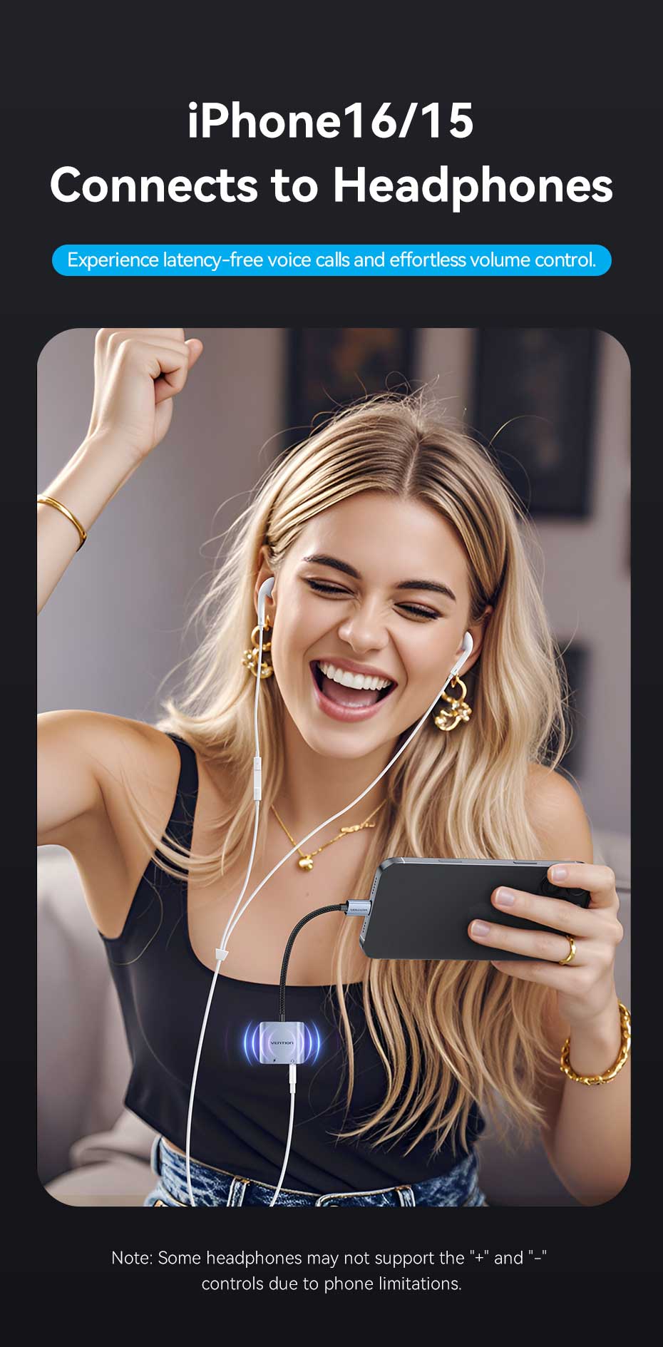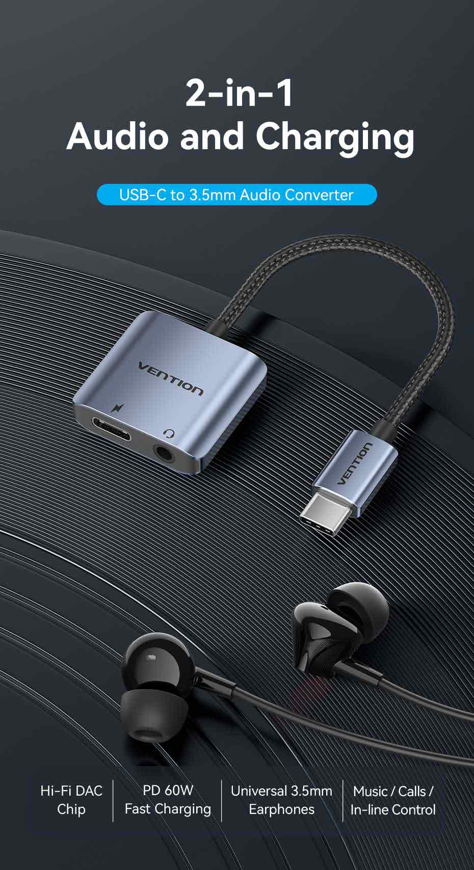 VENTION BIGHA USB-C to 3.5mm Audio Adapter with 60W PD Fast Charging, Hi-Fi DAC Chip, 384kHz/32bit HD Audio – Compatible with iPhone 15/16, Samsung S24, MacBook, Gaming Headsets