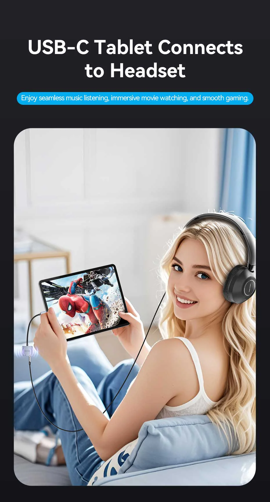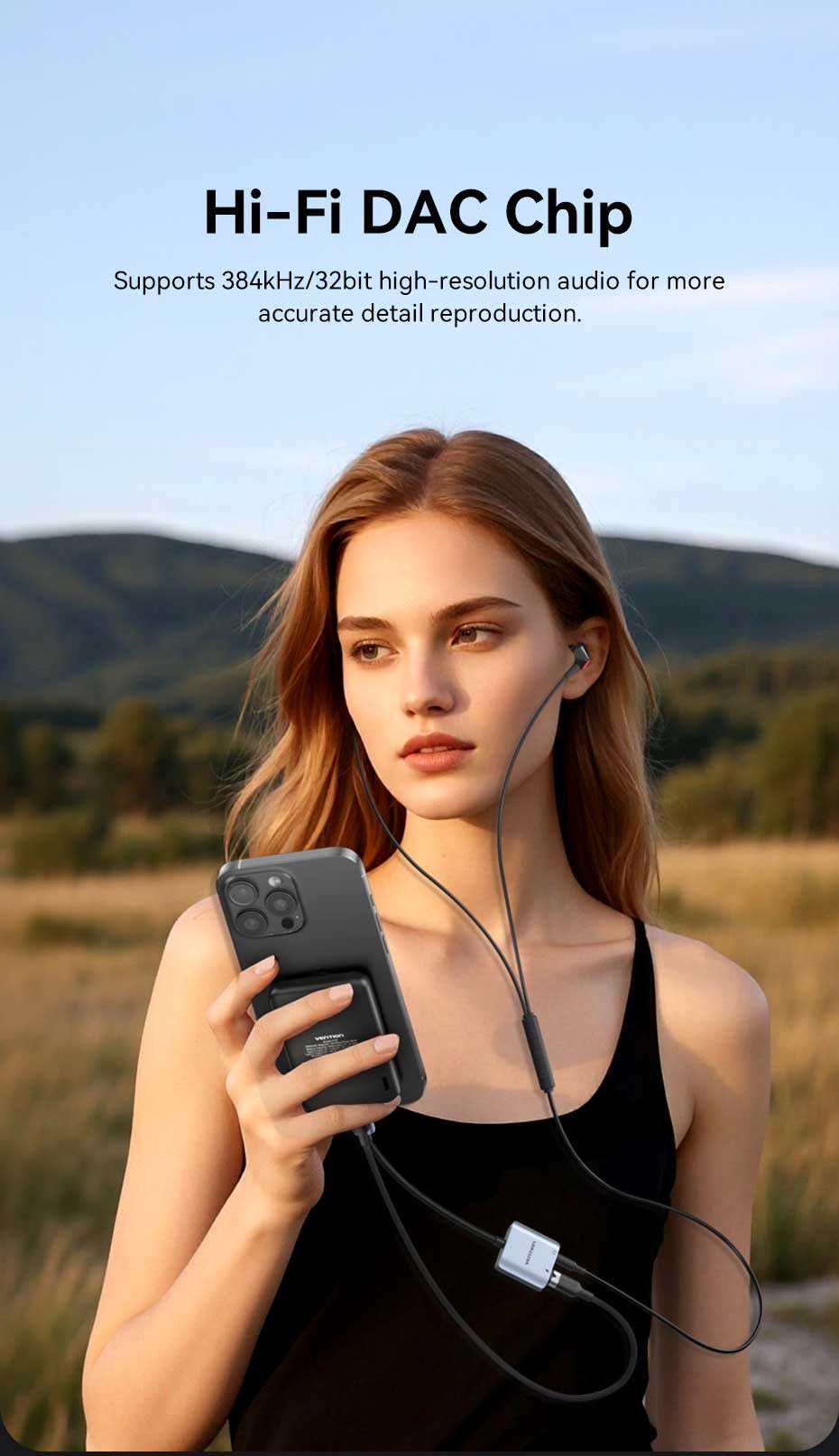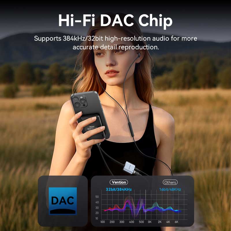 At the heart of the BIGHA adapter lies a premium Hi-Fi DAC chip capable of decoding 384kHz/32bit high-resolution audio. This represents an 8x improvement over standard smartphone DACs (typically limited to 48kHz/16bit), delivering studio-grade clarity with a 112dB signal-to-noise ratio. Whether you’re listening to lossless tracks on Apple Music, mixing audio in GarageBand, or gaming with spatial audio, every frequency – from 20Hz bass tones to 20kHz highs – is reproduced with exceptional accuracy.
