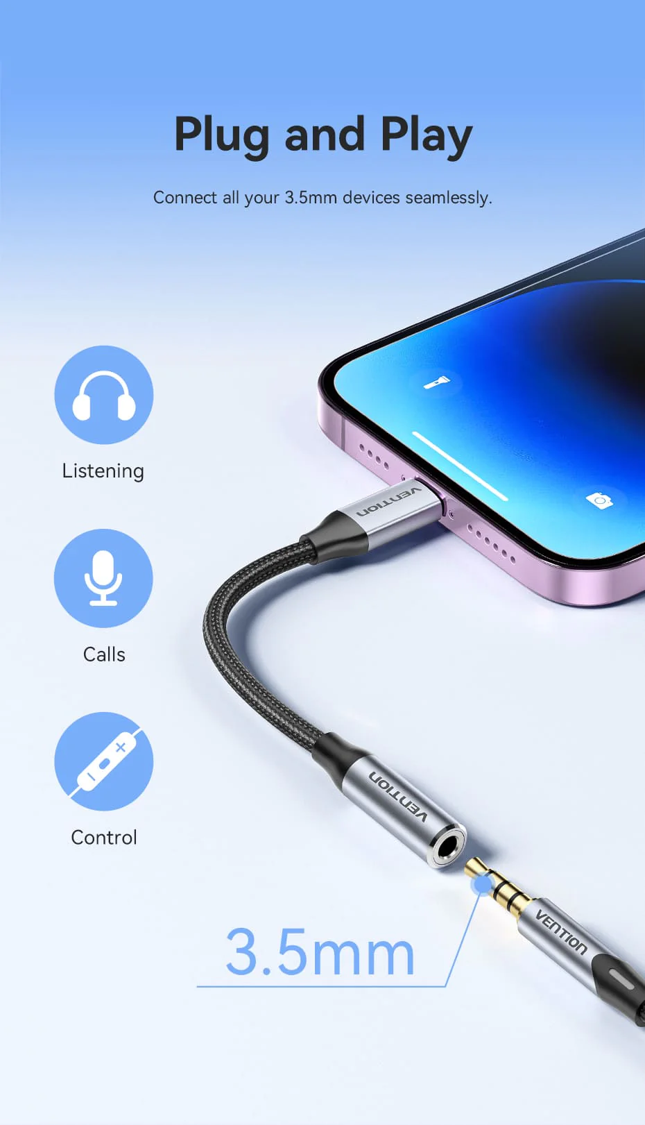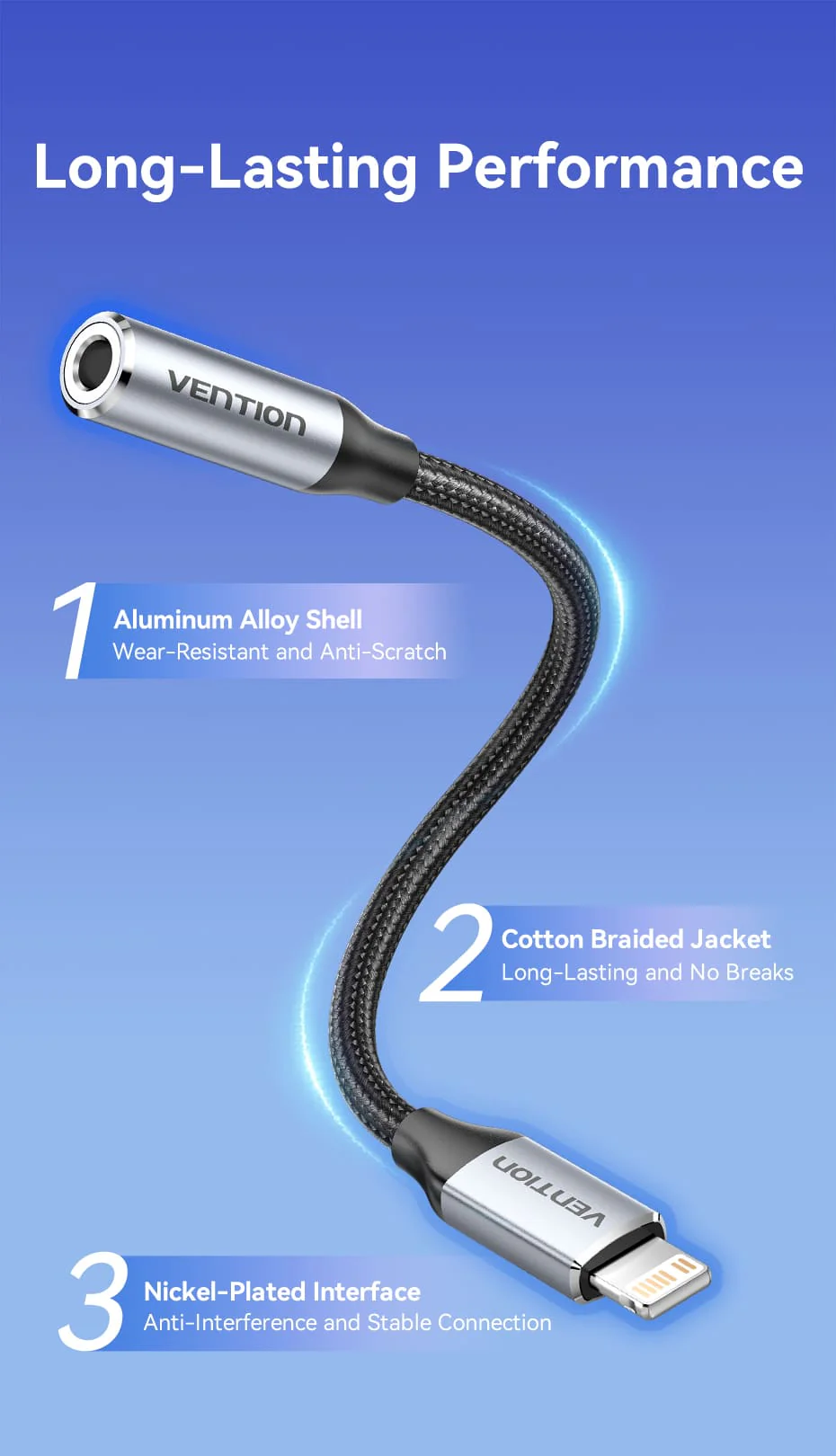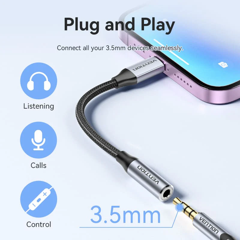 The Vention BMBHA Lightning to 3.5mm Audio Adapter bridges the gap between your iPhone (Lightning port) and traditional 3.5mm audio devices, such as car stereos, headphones, or home speakers. Designed for audiophiles and daily commuters, this adapter ensures high-fidelity sound reproduction with a 48KHz@16bit sampling rate, so you enjoy every note without compromise.