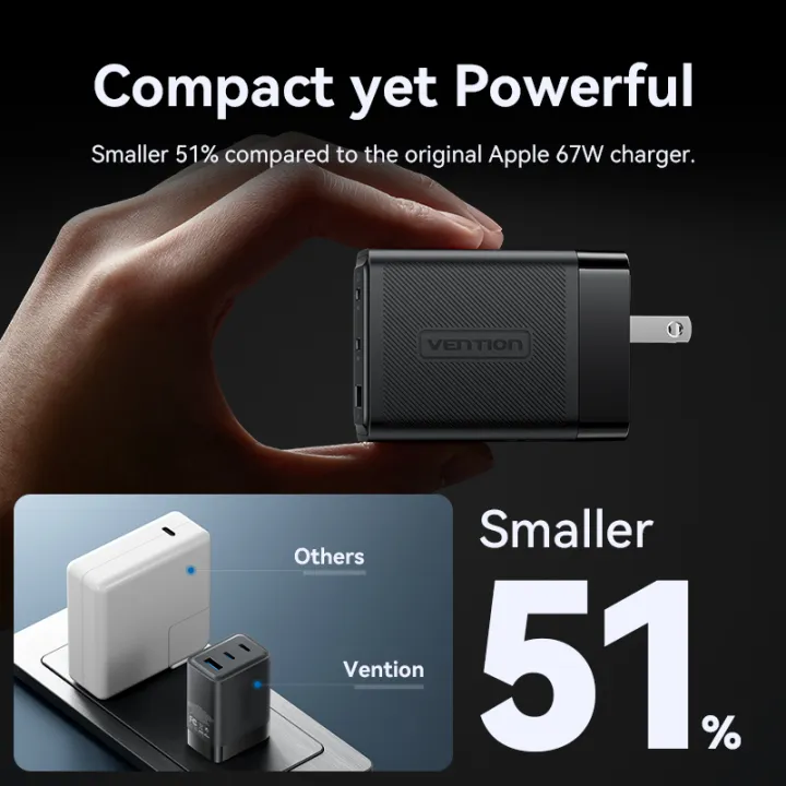 The Vention FERB0-US 65W GaN Charger is a powerful 3-port fast charger designed for laptops, smartphones, tablets, and other USB-powered devices. With next-generation GaN technology, this charger delivers higher efficiency, faster heat dissipation, and a compact form factor—making it an ideal solution for travelers, professionals, and home users.