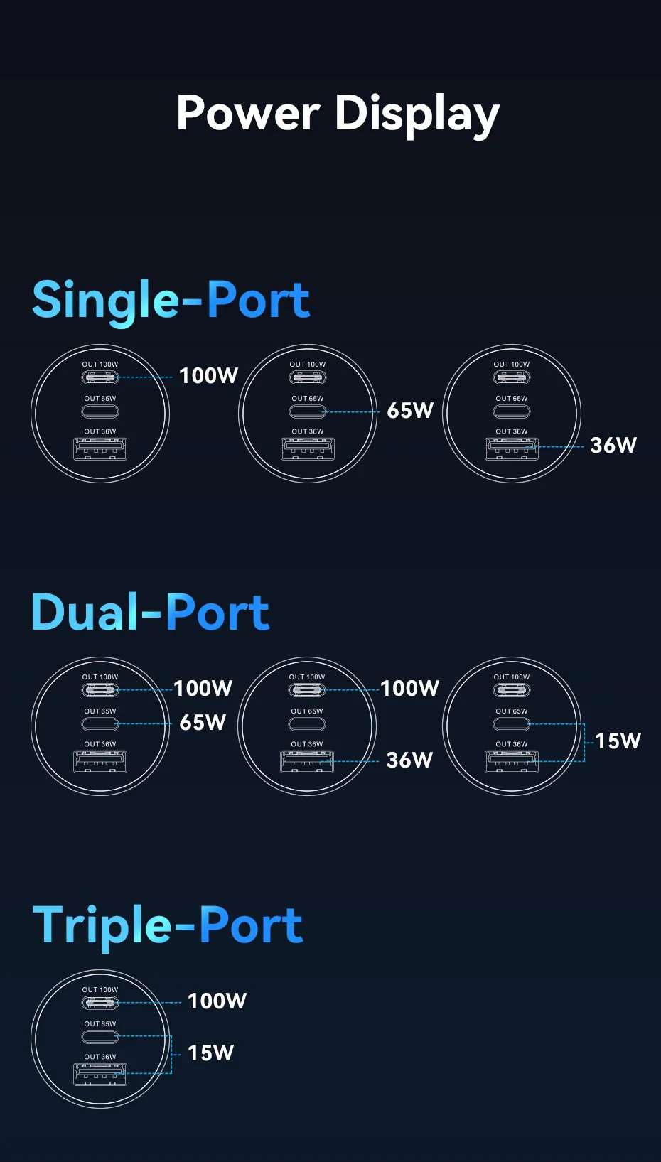 A: Yes! When using USB-C1 (100W) + USB-C2 (65W), USB-A drops to 15W.