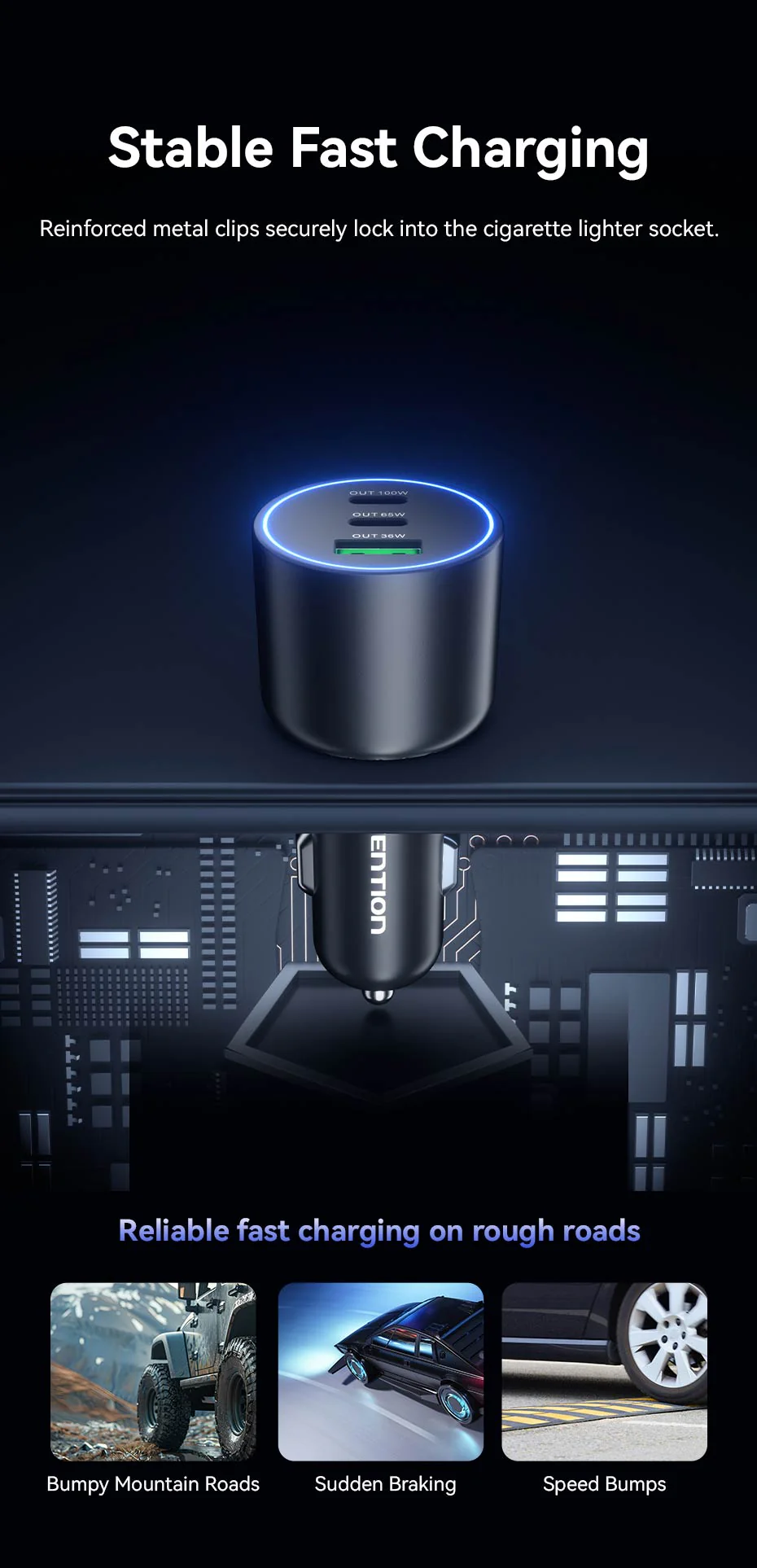 Power all your devices on the go with the Vention 165W Triple-Port Car Charger, featuring 100W PD + 65W PD + 30W USB-A outputs. Perfect for road warriors, this charger delivers: