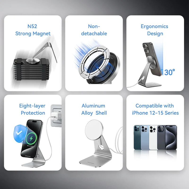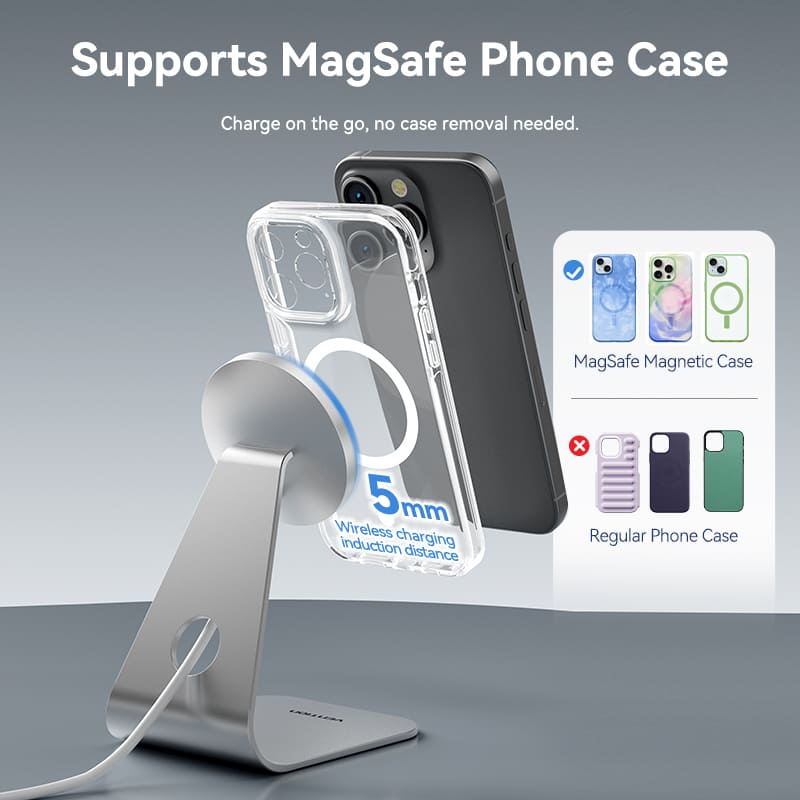 The aluminum alloy body ensures efficient heat dissipation, and the 5N magnetic array holds devices firmly even in portrait or landscape mode. Compatible with MagSafe cases (or slim non-MagSafe cases under 5mm), it’s ideal for bedside tables, desks, or travel.