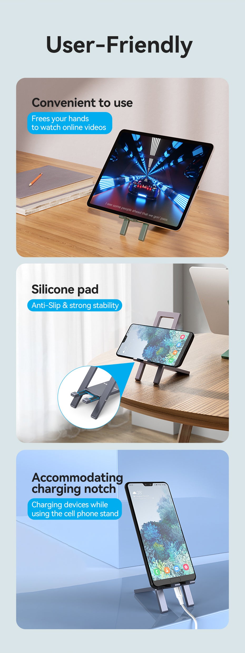 With universal compatibility, the Vention KCYH0 supports a wide range of devices, including iPhones, Android phones, tablets, and other USB-powered gadgets. Whether you’re at home, in the office, or traveling, this stand offers ergonomic convenience without compromising on portability.