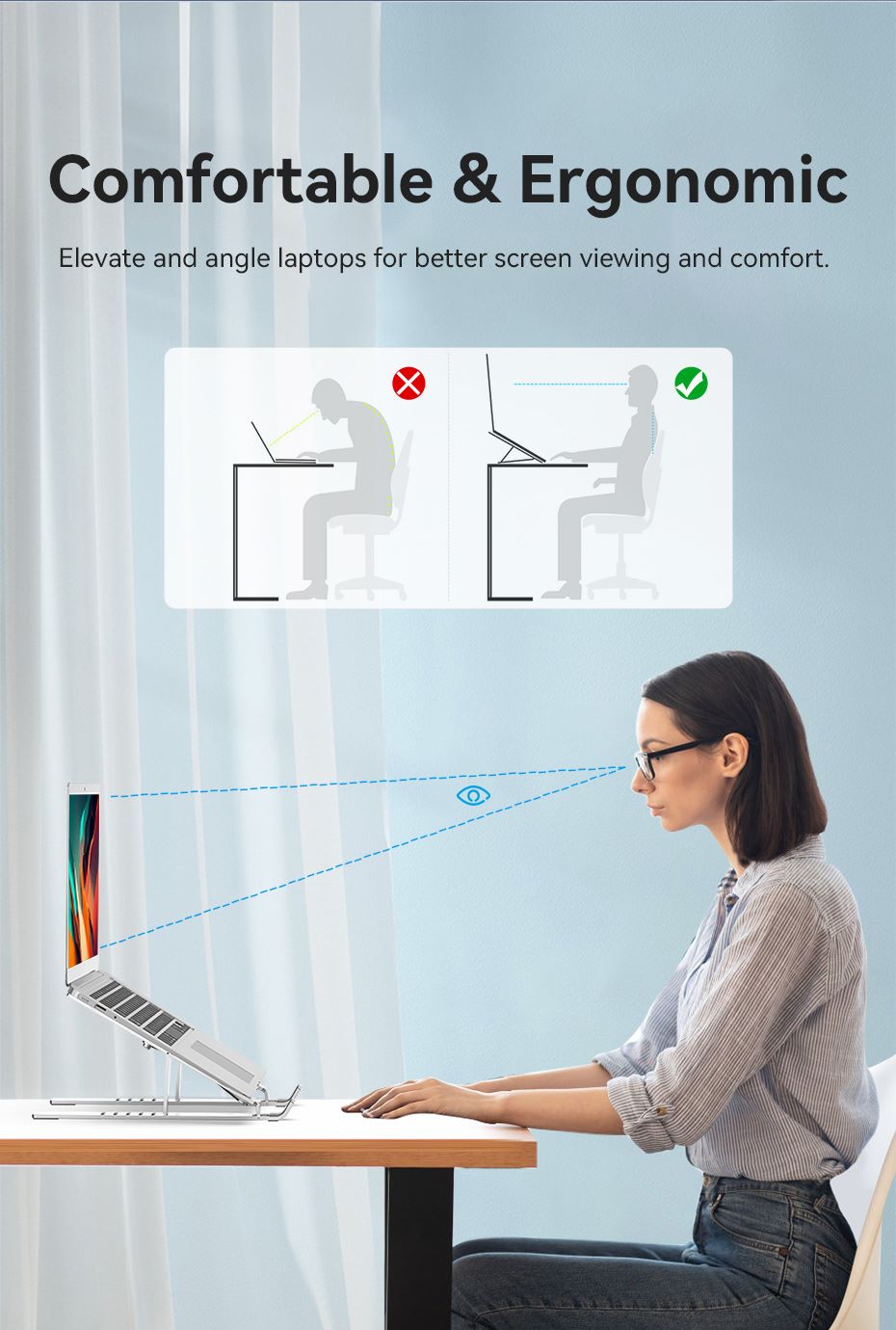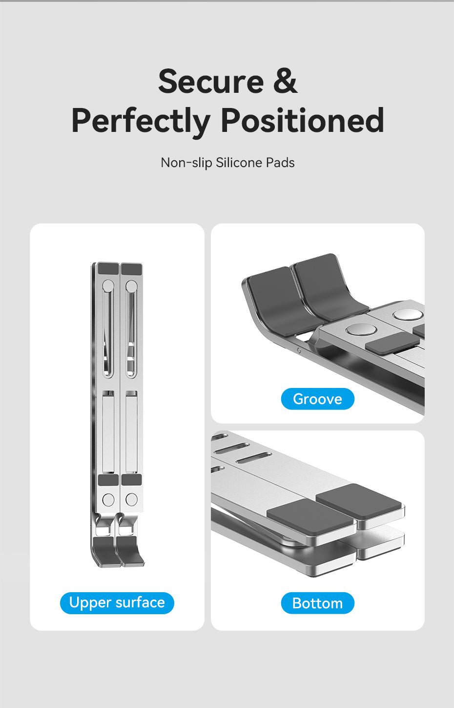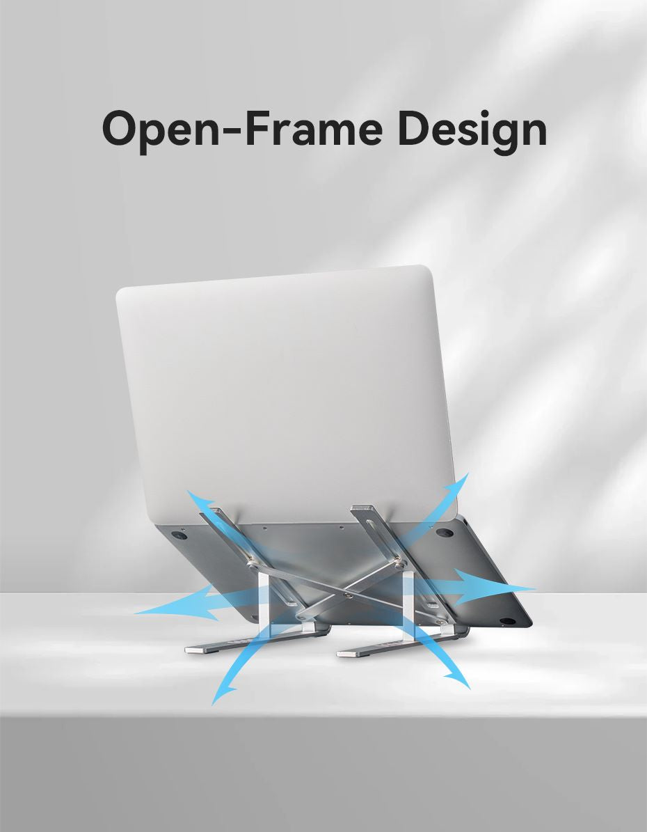 Equipped with anti-slip silicone foot pads, the stand prevents slipping and protects surfaces from scratches. Additionally, its open design ensures optimal airflow, preventing laptop overheating and maintaining peak performance.