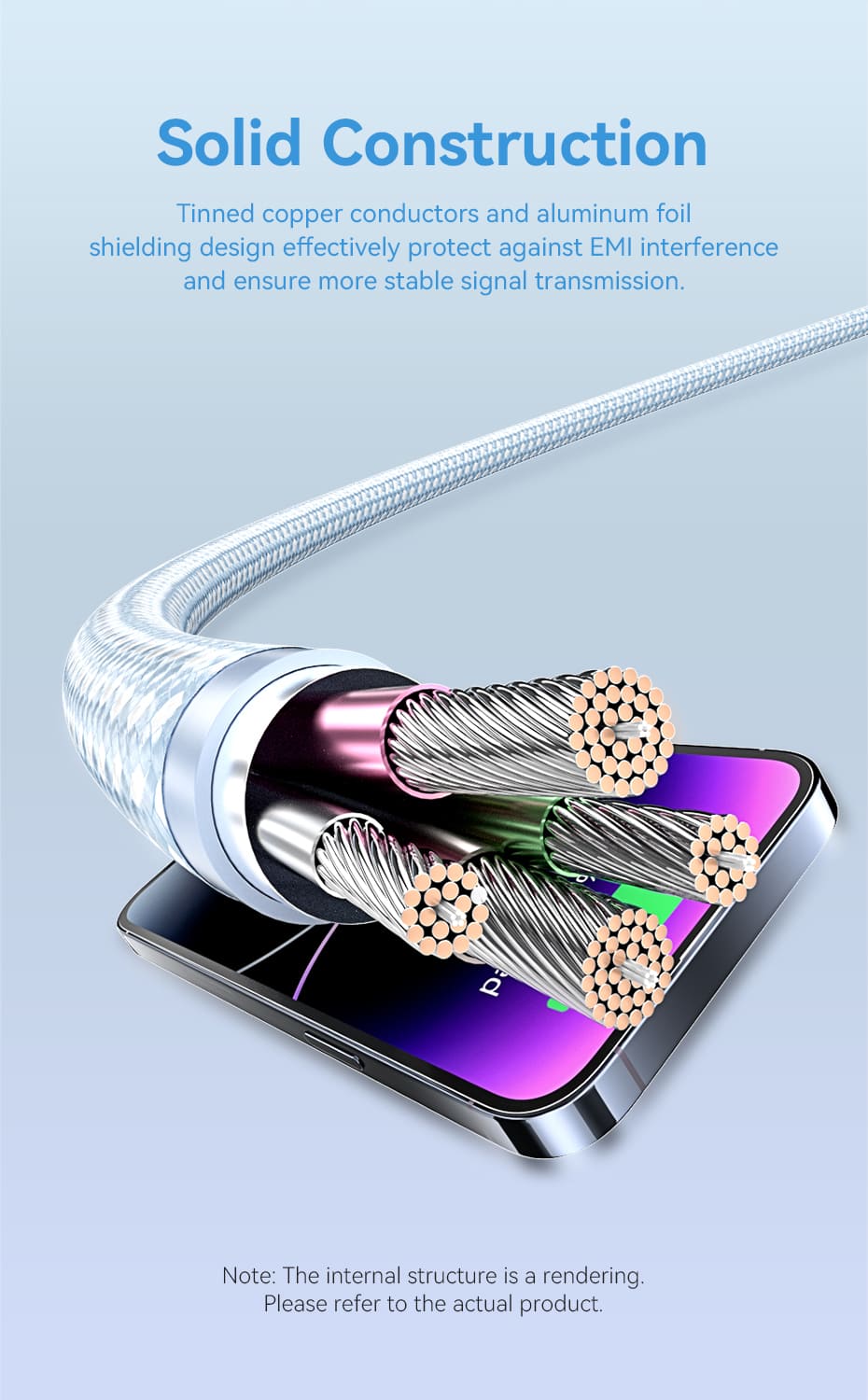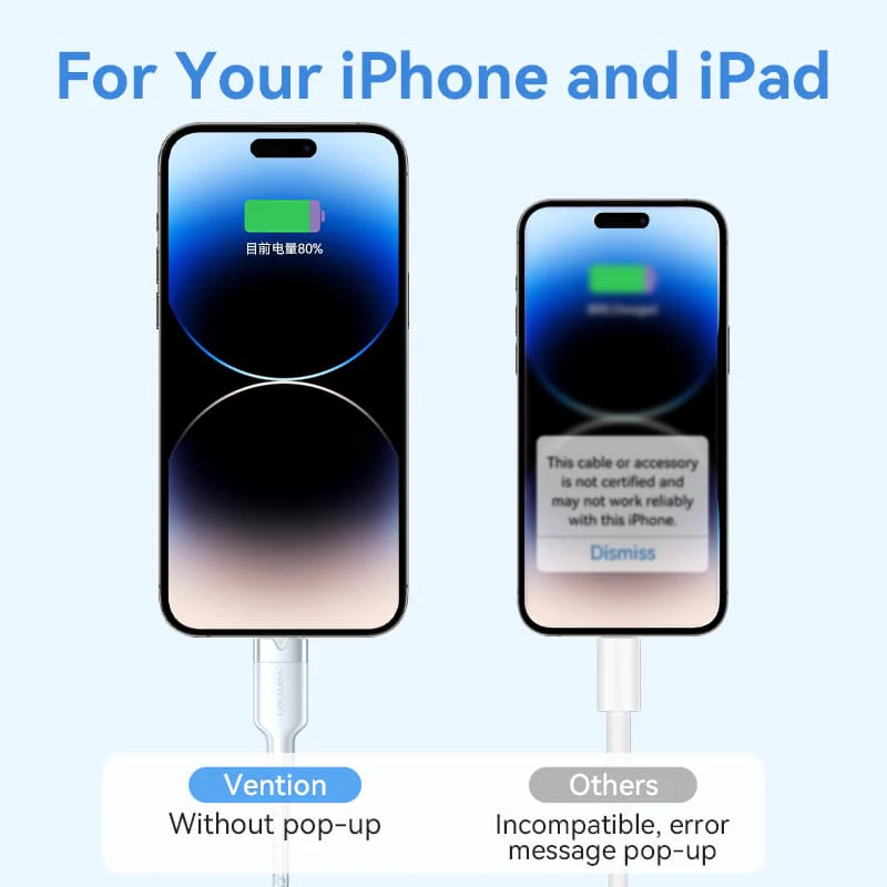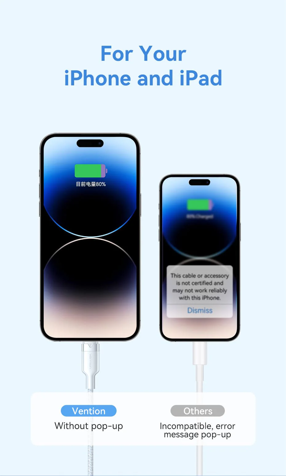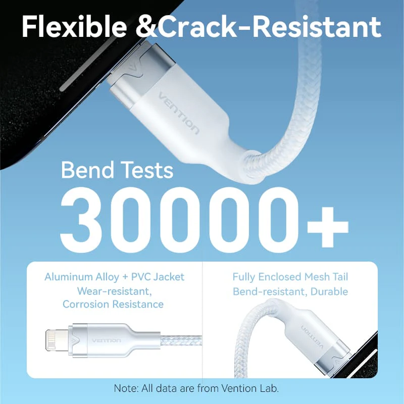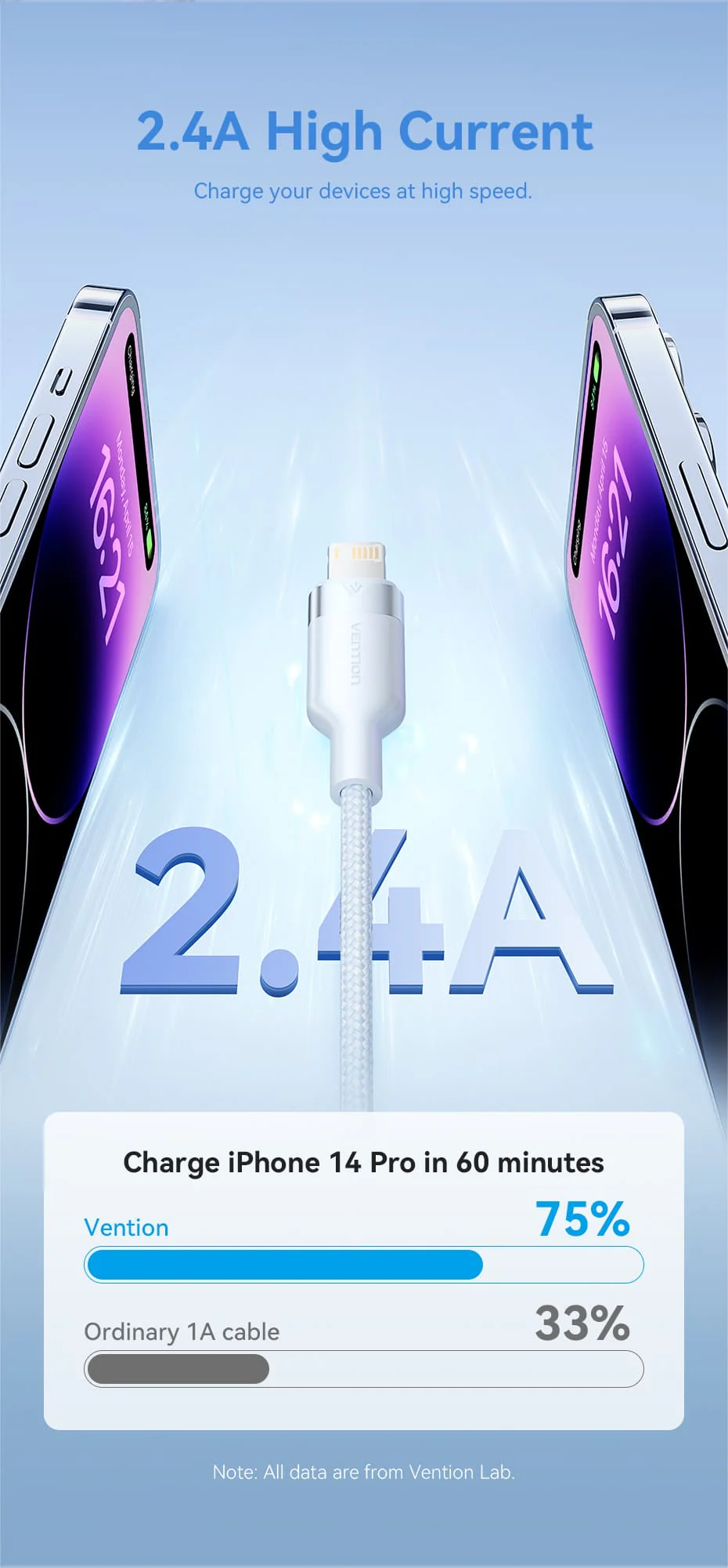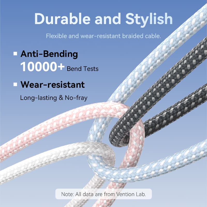 Built to last, the Vention Lightning cable features a nylon braided jacket and aluminum alloy shell, providing superior durability and resistance to tangling. The nickel-plated connectors and tinned copper conductors ensure optimal conductivity and corrosion resistance, while the aluminum foil shielding protects against interference.