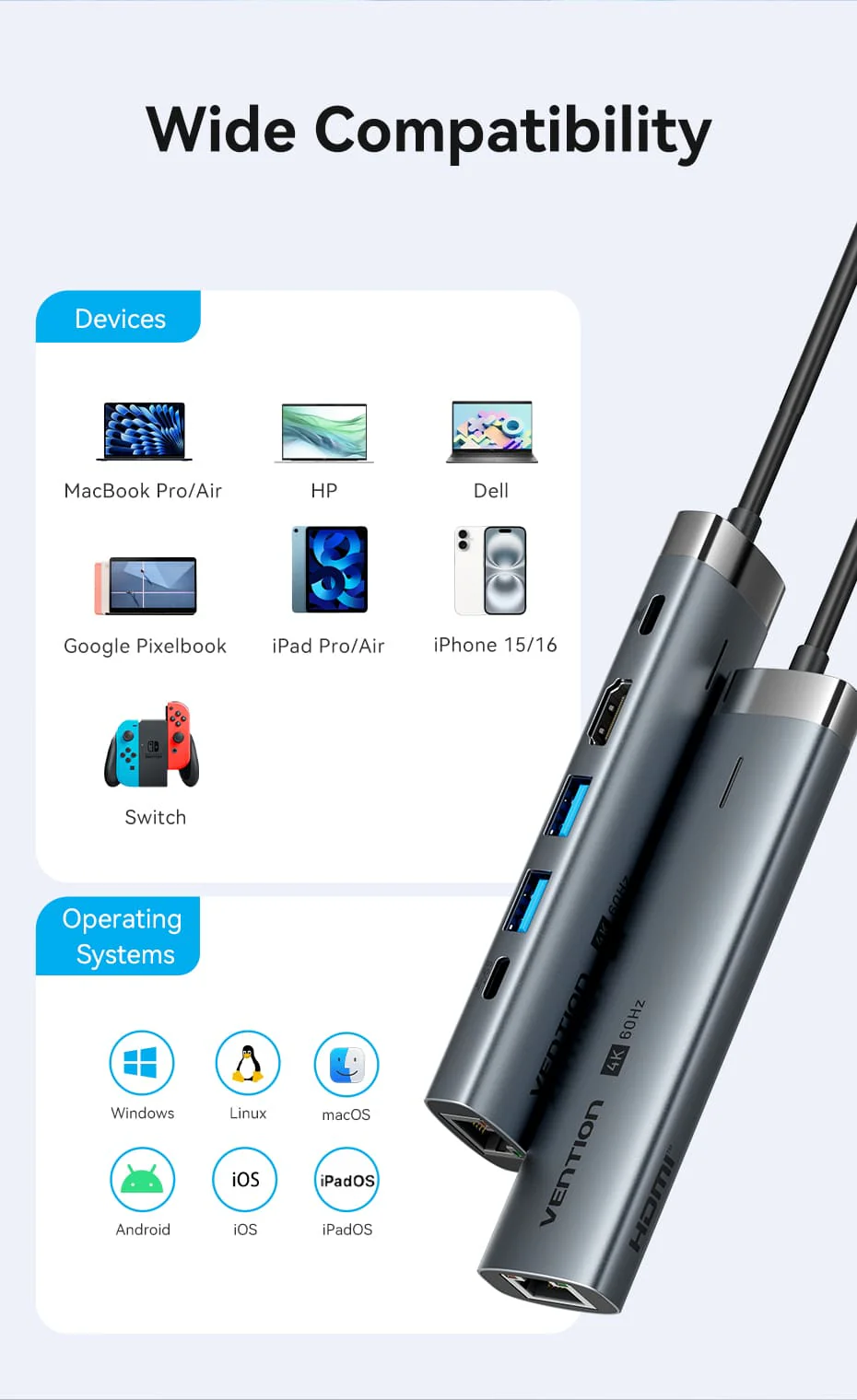 The Vention TGNHB 6-in-1 USB-C Docking Station revolutionizes productivity by expanding your laptop’s capabilities through a single USB-C connection. Designed for professionals, creatives, and power users, this docking station combines high-resolution display output, fast charging, and versatile connectivity in a compact, portable form factor.
