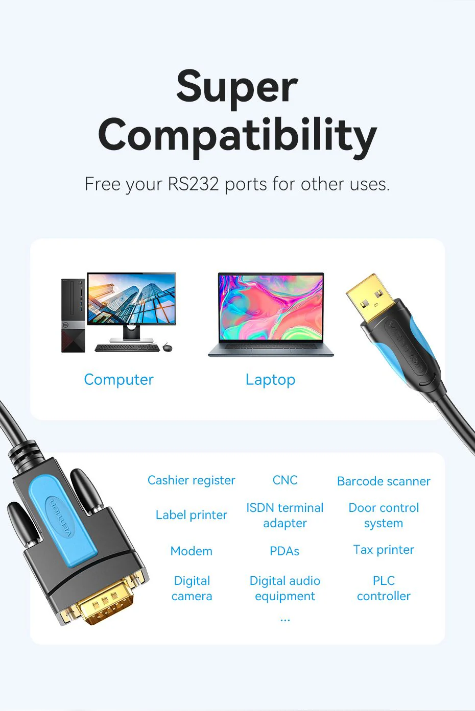 The Vention USB to Serial RS232 DB9 Adapter Cable (1.5M) is an industrial-grade solution for connecting legacy serial devices to modern USB ports. This adapter allows seamless data transfer between computers and RS232-compatible devices such as barcode scanners, CNC machines, industrial equipment, modems, cash registers, and more.