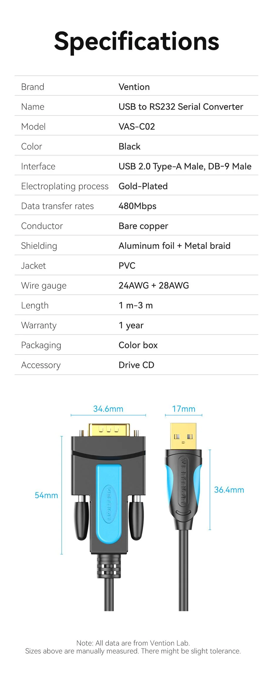 - Interface: USB 2.0 Type-A Male to DB-9 Male